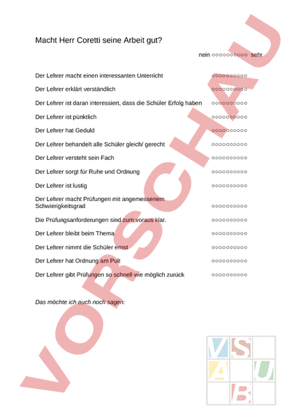 Macht Herr Coretti seine Arbeit gut? nein sehr Der Lehrer macht einen interessanten Unterricht Der Lehrer erklärt verständlich Der Lehrer ist daran interessiert, dass die Schüler Erfolg haben Der Lehrer ist pünktlich Der Lehrer hat Geduld Der Lehrer behandelt alle Schüler gleich/ gerecht Der Lehrer versteht sein Fach Der Lehrer sorgt für Ruhe und Ordnung Der Lehrer ist lustig Der Lehrer macht Prüfungen mit angemessenem Schwierigkeitsgrad Die Prüfungsanforderungen sind zum voraus klar. Der Lehrer bleibt beim Thema Der Lehrer nimmt die Schüler ernst Der Lehrer hat Ordnung am Pult Der Lehrer gibt Prüfungen so schnell wie möglich zurück Das möchte ich auch noch sagen: