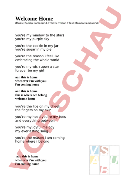Welcome Home (Musik: Roman Camenzind, Fred Herrmann Text: Roman Camenzind) youre my window to the stars youre my purple sky youre the cookie in my jar youre sugar in my pie youre the reason feel like embracing the whole world youre my wish upon star forever be my girl aah this is home whenever im with you im coming home aah this is home this is where we belong welcome home youre the lips on my cheek the fingers on my skin youre my head youre my toes and everything between youre my joyful melody my everlasting song youre the reason am coming home where belong aah this is home whenever im with you im coming home aah this is home this is where we belong welcome home (2x) rain drops sun shine honey just wanna come home to you snow flakes star lights honey this is where belong – im coming home to you im so lucky in love when call your name picture you in my picture frame im so lucky in love when see you smile this is my place this is my time (2x) aah this is home whenever im with you im coming home aah this is home this is where we belong welcome home
