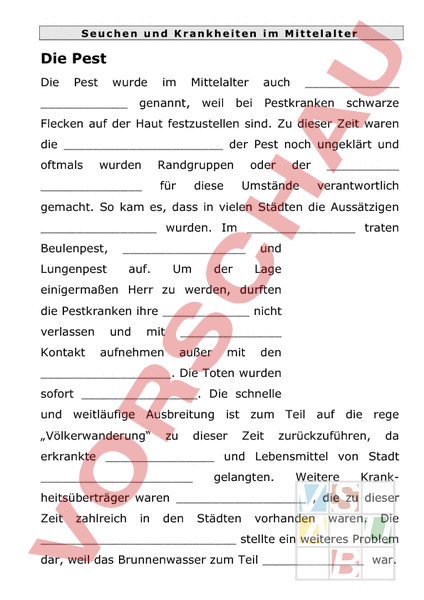 Ein Lückentext zur Pest im Mittelalter. Anschliessend die Auswahl der "Füllwörter" und auch noch Fragen zum Text.