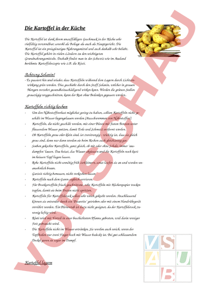 Die Kartoffel in der Küche Die Kartoffel ist dank ihrem unauffälligen Geschmack in der Küche sehr vielfältig verwendbar; sowohl als Beilage als auch als Hauptgericht. Die Kartoffel ist ein preisgünstiges Nahrungsmittel und auch deshalb sehr beliebt. Die Kartoffel gehört in vielen Ländern zu den wichtigsten Grundnahrungsmitteln. Deshalb findet man in der Schweiz wie im Ausland berühmte Kartoffelrezepte wie z.B. die Rösti. Achtung Solanin! Es passiert hin und wieder, dass Kartoffeln während dem Lagern durch Lichtein wirkung grün werden. Dies geschieht durch den Stoff Solanin, welcher in grossen Mengen verzehrt gesundheitsschädigend wirken kann. Werden die grünen Stellen grosszügig weggeschnitten, kann der Rest ohne Bedenken gegessen werden. Kartoffeln richtig kochen Um den Nährstoffverlust möglichst gering zu halten, sollten Kartoffeln nicht ge schält im Wasser liegengelassen werden (Ausschwemmen von Nährstoffen). Kartoffeln, die nicht geschält werden, mit einer Bürste mit festen Borsten unter fliessendem Wasser putzen, damit Erde und Schmutz entfernt werden. Ob Kartoffeln gross oder klein sind, ist zweitrangig wichtig ist, dass sie gleich gross sind, denn nur dann werden sie beim Kochen auch gleichzeitig gar. Soeben gekochte Kartoffeln, ganz gleich, ob mit oder ohne Schale, immer aus dampfen lassen. Das heisst, das Wasser abgiessen und die Kartoffeln noch kurz im heissen Topf liegen lassen. Rohe Kartoffeln nicht unnötig früh zerkleinern, sonst laufen sie an und werden un ansehnlich braun. Garzeit richtig bemessen, nicht verkochen lassen Kartoffeln nach dem Garen sogleich servieren. Für Bratkartoffeln frisch geschnittene, rohe Kartoffeln mit Küchenpapier trocken tupfen, damit sie beim Braten nicht spritzen. Kartoffeln für Kartoffelstock sollen sehr weich gekocht werden. Anschliessend können sie entweder durch ein Passevite getrieben oder mit einem Handrührgerät verrührt werden. Ein Pürierstab ist dazu nicht geeignet, da der Kartoffelstock zu wenig luftig wird. Rösti wird mit Vorteil in einer beschichteten Pfanne gebraten, weil darin weniger Fett gebraucht wird. Die Kartoffeln nicht im Wasser ertränken. Sie werden auch weich, wenn der Topfboden nur zwei Finger hoch mit Wasser bedeckt ist. Bei gut schliessendem Deckel garen sie sogar im Dampf. Kartoffel lagern Unter 4º verwandelt sich die Kartoffelstärke in Zucker und die Kartoffeln schmecken dann süss. Deshalb nicht im Kühlschrank aufbewahren. Die günstigeste Lagertemperatur liegt bei 8º 10º C. Steigt die Temperatur, fangen die Kartoffeln an zu keimen und werden schnell schrumpelig, d.h. sie altern. Zu den modernen Wohnungen/Häusern gehören in der Regel keine Keller, die den Ansprüchen für eine gute Lagerung genügen. Deshalb werden Kartoffeln vorteilhaft in kleinen, überschaubaren Mengen (Portionen) gekauft, wie sie heute standardmässig angeboten werden. Die Kartoffel hat viele Namen Erdapfel, Knolle, Kantuffel, Erdtüffel, Gummel (Innerschweiz) u.v.a. Kartoffel in 14 Sprachen Englisch Dänisch Finnisch Französisch Italienisch Norwegisch Österreichisch Potato Kartoffel Peruna Pomme de terre Patata Potet Erdäpfel Die Kartoffelpflanze Polnisch Ziemniak Portugiesisch Batata Russisch Kartochka Schwedisch Potatis Slowakisch Zemiak Türkisch Patates Ungarisch Burgonya