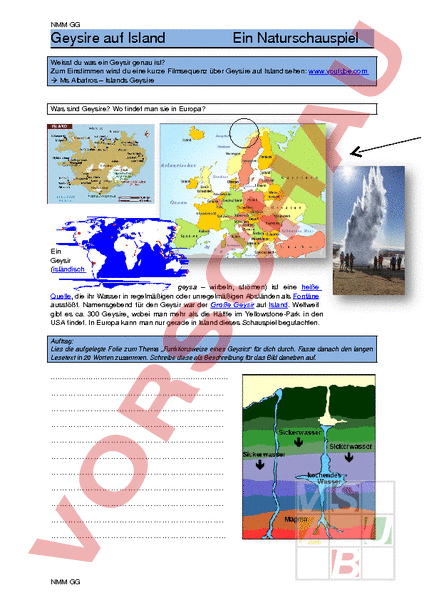 Was sind Geysire? Wo können sie in Europa bestaunt werden? Ein Themeneinstieg und Infoteil. Einfliessende Lerntechnik: Texte kürzen und in Stichworte zusammenfassen.