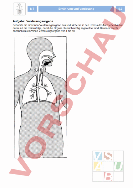 NT Ernährung und Verdauung 5.2 Aufgabe: Verdauungsorgane Schneide die einzelnen Verdauungsorgane aus und klebe sie in den Umriss des Menschen! Achte dabei auf die Reihenfolge, damit die Organe räumlich richtig angeordnet sind! Benenne rechts daneben die einzelnen Verdauungsorgane von 1 bis 10.