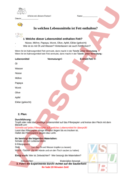 Arbeite mit deinem Partner! Datum: Name: In welchen Lebensmitteln ist Fett enthalten? 1. Welche dieser Lebensmittel enthalten Fett? Nüsse, Möhre, Papaya, Wurst, Olive, Apfel, Eiklar (gekocht) Wie ist es mit Öl und Wasser? Hinterlassen sie auch Fettflecken? Wenn ihr im Nahrungsmittel Fett vermutet, dann macht in der Tabelle unter Vermutung Wenn ihr im Nahrungsmittel kein Fett vermutet, dann macht in der Tabelle unter Vermutung Lebensmittel Vermutung/- Enthält Fett /- Öl Wasser Nüsse Möhre Papaya Wurst Olive Apfel Eiklar (gekocht) 2. Plan: Durchführung: Tropft oder reibt das jeweilige Lebensmittel auf das Filterpapier und kreise den Fleck mit dem Bleistift um! Schreibt auf jedes Filterpapier auf, welches Lebensmittel ihr überprüft! Lasst das Filterpapier einige Minuten liegen bis es trocken ist. Haltet die Filterpapiere gegen das Licht. Ihr benötigt die folgenden Materialien: Schale mit den Lebensmitteln 9 Filterpapiere Stab (um das Öl und Wasser tropfen zu lassen) Wisch -Tücher (für die Hände und um den Tisch sauber zu halten) Einigt euch: Wer ist Zeitwächter? Wer besorgt die Materialien? Zeitwächter: Materialien besorgt:_ 3. Führt die Experimente durch! Achtet auf die Sauberkeit! Ihr habt 20 Minuten Zeit! Arbeite mit deinem Partner! Datum: Name: 4. Was beobachtet ihr? der Fleck bleibt macht ein in eure Beobachtungstabelle der Fleck verschwindet macht ein in eure Beobachtungstabelle Tragt die Ergebnisse in die Tabelle oben ein! Räumt euren Platz auf!