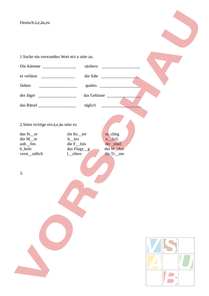Deutsch:ä,e,äu,eu 1.Suche ein verwandtes Wort mit oder au. Die Kämme säubern er verlässt die Säle färben quälen der Jäger das Gehäuse das Rätsel täglich 2.Setze richtige ein:ä,e,äu oder eu das Ster die Mte anhfen h_keln verstndlich 3. die Krter hlen die Flnis das Flugzg lchten m_chtig nlich derrmel der W_cker die Trme