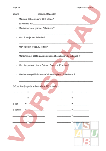 Etape 29 Le pronom possessif 1 Mme raconte. Réponds! Ma mère est secrétaire. Et la tienne? La mienne est Ma chambre est grande. Et la tienne? Mon lit est jaune. Et le tien? Mon vélo est rouge. Et le tien? Ma famille est petite (pas de cousins et cousines!). Et la tienne Mon film préféré cest « Batman Begins ». Et le tien Ma chanson préféré cest « Call me maybe ». Et la tienne 2 Complète (regarde le livre à la p. 72) et traduis: le tien la tienne