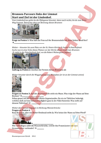 Brunnen-‐Parcours links der Limmat Start und Ziel ist der Lindenhof. Vom Lindenhof aus gehst du die Pfalzgasse hinunter, dann nach rechts, bis du zum Renn-‐ Weg kommst. Betrachte oben am Rennweg diesen Brunnen: Frage zu Posten 1: Was hält die Frau auf der Brunnensäule mit ihrer linken Hand fest? à Weiter – hinunter bis zum Platz vor der St. Peters-‐Kirche. Er heisst St.Peterhofstatt Suche nun in einer Ecke dieses Platzes vor der Kirche diesen modernen Brunnen: Er steht in der Peterhofstatt dort, wo die Robert Walsergasse beginnt. Auftrag zu Posten 2: Zeichne die Formen dieses Brunnens ab: Weiter hinunter durch die Weggengasse zum Weinplatz (er ist an der Limmat unten) Fragen zu Posten 3: Auf der Brunnensäule steht ein Mann. Was trägt der Mann auf dem Rücken? à_ Schau genau auf die Unterseite dieses Gegenstandes. Da ist ein Täfelchen befestigt, welches dich auf eine Sehenswürdigkeit ganz in der Nähe hinweist. Was steht auf diesem Täfelchen? à Weiter der Limmat entgegen in Richtung Münsterbrücke: Fragen zu Posten 4: Kein Brunnen, aber ein Reiter-‐Denkmal steht da. Wie heisst der Mann auf dem Pferd? à_ Wie viele Bögen zählt die Münsterbrücke, welche das Fraumünster mit dem Grossmünster verbindet? à _ Brunnenparcours Zürich 2012 1 Weiter geht es bis zum See. Dort über die Quaibrücke. Nun am rechten Ufer der Limmat entlang bis Hechtplatz, wo dieser Brunnen steht: Frage zu Posten 5: Durch wie viele Brunnenrohre fliesst hier Wasser? à Wann wurde dieser Brunnen erbaut? à _ Weiter durch den Schiffländeplatz bis zum Haus Limmatquai 42, dem Haus zum Rüden. Auf der Seite gegen den Fluss hin steht ein Brunnen mit dieser Figur auf der Säule: Frage zu Posten 6: Die Brunnenrohre kommen aus Tiermäulern heraus. Was für Tiere sind das? à _ Weiter auf dem Limmatquai in Flussrichtung, am Rathaus und am Zunfthaus Zum Safran vorbei, dann die Marktgasse hinauf bis zur ersten grösseren Gasse, wo du nach links gehst. Nach wenigen Metern wird die Stüssihofstatt erreicht Schau den Brunnen mit dieser Figur (es ist Rudolf Stüssi) genau an: Frage zu Posten 7: Aus wie vielen Rohren strömt Wasser heraus? à _ Brunnenparcours Zürich 2012 2 Weiter in Richtung Hirschenplatz. Dort geht es links hinunter durch die Rosengasse bis zu diesem Torbogen: Durch diesen Torbogen hinein in den Rosenhof-‐Platz. Hier steht dieser Brunnen: Fragen zum Posten 8 Ist dieser Brunnen im Andenken an eine Zürcher Persönlichkeit gebaut worden? O Wenn ja, an welche? O Ulrich Zwingli O Rudolf Brun O Heinrich Pestalozzi O Roger Federer O Nein, für keine Zürcher Persönlichkeit Wann wurde der Brunnen im Rosenhof erbaut? à Von hier aus ist der Lindenhof ziemlich nah. Hier ist das Ziel des Brunnenparcours. Geht nun zum Limmatquai hinunter und folgt dem Lauf der Limmat bis zur Rudolf-‐Brun-‐Brücke. Diese überquert ihr und stiegt dann links die Oetenbachgasse hoch. Nochmals links die Lindenhofstrasse hoch bis auf den Lindenhof. à Bevor ihr alle zum Start-‐Ziel-‐Ort Lindenhof zurückkehrt, schreibt jedes seinen Namen hier auf: Gratuliere! Ihr seid fast am Ziel des Brunnenparcours angelangt und habt jetzt eine Pause beim Brunnen auf dem Lindenhof verdient! Suche nun zum Abschluss den Brunnen mit dieser Figur auf dem Lindenhof: Brunnenparcours Zürich 2012 3