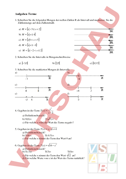 Aufgaben Terme 1. Schreiben Sie die folgenden Mengen der reellen Zahlen als Intervall und markieren Sie die Zahlenmenge auf dem Zahlenstrahl. a) {x 3 2} b) {x 4} c) {x 0 x 5} d) {x 1} e) {x 2 x 2} 2. Schreiben Sie die Intervalle in Mengenschreibweise a) ] 3;3[ b) [2;5[ c) [0;3.5] 3. Schreiben Sie die markierten Mengen als Intervalle a) b) c) d) e) f) x2 4. Gegeben ist der Term ( x) x2 a) Definitionsbereich? ( 5) b) T(0) c) Für welche wird der Wert des Terms negativ? 5. Gegeben ist der Term ( x) x 1 a) Definitionsbereich? b) T(8) T(-0.5) c) Für welche nimmt der Term den Wert 0 an? 6. Gegeben ist der Term ( x) 16 2 a) Definitionsbereich? b) T(-3) T(3) T(0) c) Für welche nimmt der Term den Wert 12 an? d) Für welche Werte von ist der Wert des Terms natürlich?