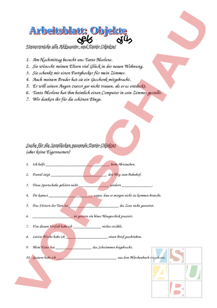 Unterstreiche alle Akkusativ und DativObjekte! 1. 2. 3. 4. 5. 6. 7. Am Nachmittag besucht uns Tante Marlene. Sie wünscht meinen Eltern viel Glück in der neuen Wohnung. Sie schenkt mir einen Partyhocker für mein Zimmer. Auch meinem Bruder hat sie ein Geschenk mitgebracht. Er will seinen Augen zuerst gar nicht trauen, als er es entdeckt. Tante Marlene hat ihm heimlich einen Computer in sein Zimmer gestellt. Wir danken ihr für die schönen Dinge. Suche für die Satzlücken passende DativObjekte! (aber keine Eigennamen) 1. Ich helfe beim Abwaschen. 2. Daniel zeigt den Weg zum Bahnhof. 3. Diese Sportschuhe gehören nicht sondern. 4. Du kannst sagen, dass er morgen nicht zu kommen braucht. 5. Das Füttern der Tiere ist des Zoos nicht gestattet. 6. ist gestern ein böses Missgeschick passiert. 7. Von diesem Vorfall habe ich nichts erzählt. 8. Letzte Woche habe ich einen Brief geschrieben. 9. Mein Vater hat das Schwimmen beigebracht. 10. Gestern habe ich aus dem Märchenbuch vorgelesen.