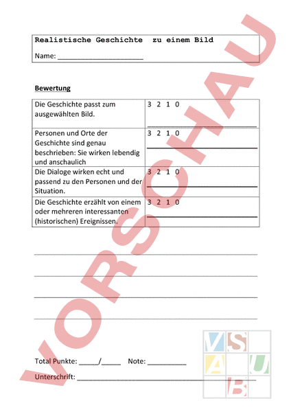 Realistische Geschichte zu einem Bild Name: Bewertung Die Geschichte passt zum ausgewählten Bild. Personen und Orte der Geschichte sind genau beschrieben: Sie wirken lebendig und anschaulich Die Dialoge wirken echt und passend zu den Personen und der Situation. Die Geschichte erzählt von einem oder mehreren interessanten (historischen) Ereignissen. 3 2 1 0 3 2 1 0 3 2 1 0 3 2 1 0 Total Punkte: _/_ Note: Unterschrift: