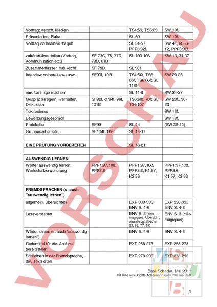 Vortrag: versch. Medien TS4:59, TS5:69 SW 10f. Präsentation; Plakat SL 50 SW 10f. Vortrag vorlesen/vortragen SL 54-57, PPP3:92f. SW 4f., 6f., 812, PPP3:92f. SW 13, 34-37 zuhörenbeurteilen (Vortrag, Kommunikation etc.) SF 73C, 75, 77D, 79D, 81B SL 100-103 Zusammenfassen mdl.schr. SF 79D SL 96f Interview vorbereitenausw. SF90f, 102f TS4:56f, TS5: 66f, TS6:66f; SL 116f SW 20-23 SL 114f SW 24-27 TS6:68f, 70f; SL 104-107 SW 28f., 3033 eine Umfrage machen Gesprächsregeln, -verhalten, Diskussion SF92f, cf 94f, 96f, 101B Telefonieren SW 16f. Bewerbungsgespräch SW 18f. Protokolle SF99 SL 14 Gruppenarbeit etc. SF104f, 106f SL 15-17 EINE PRÜFUNG VORBEREITEN (SW 38-42) SL 18-21 AUSWENDIG LERNEN Wörter auswendig lernen, Wortschatzerweiterung PPP1:97,108, PPP3:6 PPP1:97,108, PPP3:6, K1:57, K2:58 PPP1:97,108, PPP3:6, K1:57, K2:58 allgemein, Übersichten EXP 330-335, ENV S. 4-6 EXP 330-335, ENV S. 4-6 Leseverstehen ENV S. 3 (clés magiques, Übersicht; einzeln vgl. ENV 5: 53, 65, 77, 99) ENV S. 3 (clés magiques) Wörter lernen (s. auch auswendig lernen) ENV S. 4-6 ENV S. 4-6 Redemittel für div. Anlässe bereitstellen EXP 258-273 EXP 258-273 Schreiben in der Fremdsprache, div. Textsorten EXP 278-296 EXP 278-296 FREMDSPRACHEN (s. auch auswendig lernen) Basil Schader, Mai 2011 mit Hilfe von Brigitte Achermann und Christine Rast 3