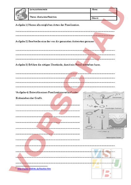 Lernzielkontrolle Thema: Evolution/Fossilien Name: Datum: Aufgabe 1) Nenne alle möglichen Arten der Fossilisation. Aufgabe 2) Beschreibe eine der von dir genannten Antworten genauer. Aufgabe 3) Erkläre die nötigen Umstände, damit ein Fossil entstehen kann. 1Aufgabe 4) Entwickle einen Fossilisationsverlauf unter Einbeziehen der Grafik. 1