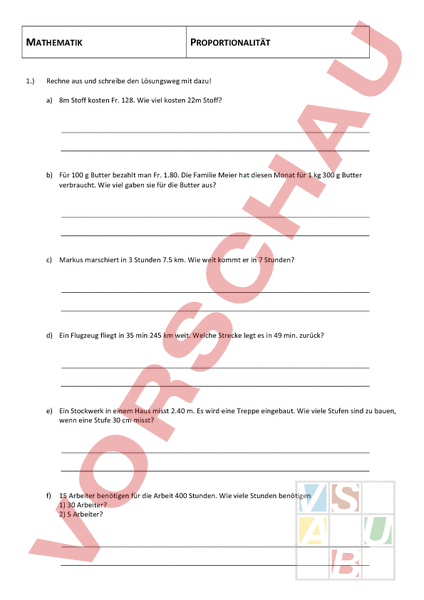 MATHEMATIK PROPORTIONALITÄT 1.) Rechne aus und schreibe den Lösungsweg mit dazu! a) 8m Stoff kosten Fr. 128. Wie viel kosten 22m Stoff? b) Für 100 g Butter bezahlt man Fr. 1.80. Die Familie Meier hat diesen Monat für 1 kg 300 g Butter verbraucht. Wie viel gaben sie für die Butter aus? c) Markus marschiert in 3 Stunden 7.5 km. Wie weit kommt er in 7 Stunden? d) Ein Flugzeug fliegt in 35 min 245 km weit. Welche Strecke legt es in 49 min. zurück? e) Ein Stockwerk in einem Haus misst 2.40 m. Es wird eine Treppe eingebaut. Wie viele Stufen sind zu bauen, wenn eine Stufe 30 cm misst? f) 15 Arbeiter benötigen für die Arbeit 400 Stunden. Wie viele Stunden benötigen 1) 30 Arbeiter? 2) 5 Arbeiter? g) 26 Schafe haben auf einer Wiese für 4 Tage Futter zu fressen. Wie lange können 8 Schafe fressen? h) Ein Planschbecken, in das 70 l Wasser pro Minute einlaufen, wäre in genau 6 Min. voll. Wie lange würde es bei einem Zulauf von 12 l pro Minute dauern? i) Für eine Dekoration hat die Lehrerin zwei gleich lange Plastikbänder. Das gelbe Band zerschneidet sie in 23 Stücke von 85 cm Länge. Wie viele Stücke zu 5 cm erhält sie vom grünen Band? j) Ein Velofahrer braucht für 45 km 2 h. Wie lange braucht er für 60 km, wenn er mit gleichem Tempo fährt? k) Wenn Herr Müller Streifen mit einer Breite von 24 cm schneidet, ergibt es 25 Streifen. Wie viele Streifen mit einer Breite von 15 cm gäbe es? l) Spart Maja 16 Fr. pro Monat, kann sie ihr Traumpony nach 1 Jahren kaufen. Wie lange muss sie sparen, wenn sie nur 12 Fr. pro Monat auf die Seite legt? m) Aus 7 Ganzen kann ich 182 Teile erstellen. Wie viele Teile kann ich aus 23 Ganzen herstellen? n) Eine Schwalbe fliegt in 27 min. 25,65 km weit. Wie weit fliegt sie in 1 h? o) 5 Wagen zu 56 Sitzplätzen zieht eine Lok über die Anden. Wegen Defekts fällt ein Wagen aus. Die Leute müssen sich deshalb auf 4 Wagen verteilen. Wie viele Personen trifft es nun auf einen Wagen? p) Für Fr. 9.60 erhält man 300 g Salami. Wie teuer kommen dich 250 g der gleichen Qualität zu stehen?? q) Herr Schneider bezahlt am Bahnschalter für eine Tageskarte nach Zürich Fr. 7.60. Der Schalterbeamte sagt: „Sie fahren doch öfters nach Zürich, nicht? Vielleicht wäre für Sie eine 6-‐Fahrten-‐Tageswahlkarte für Fr. 43.20 praktisch. Sie müssten dann nicht jedes Mal extra lösen. Berechne, ob sich das für Herrn Schneider lohnt? r) Franz kommt mit 12 Pedalumdrehungen 78 m weit. Für seinen Schulweg braucht er genau 106 Umdrehungen. Wie lange ist sein Schulweg? s) Ein Auto verbraucht für 120 km 8 Liter Benzin? 1) Wie viel verbraucht das Auto für 75 km und für 435 km? 2) Wie weit kommt das Auto mit 40 Litern und mit 41 Litern? t) Eine Maschine stellt in 2 h 20 min 23100 Schrauben her. Wie viele Schrauben stellt sie her, wenn sie von 07:15h bis 12:00h eingeschaltet ist? 2.) Ergänze die folgende Darstellung. Du kaufst verschiedene Schokoladentafeln. Wie viel kostet 1, 2, 3 oder 8 Tafeln? 1 Tafel 2 Tafeln 3 Tafeln 8 Tafeln Nussschokolade 2.60 Fr. Milchschokolade 5.50 Fr. weisse Schokolade 16.80 Fr. Es sind 60 Pferde mit dem Zug zu transportieren. Wie viele Pferde müssen sich einen Zugwagen teilen? Anzahl Zugwagen 1 3 4 5 10 Pferde pro Wagen Antonia hat Geld für die Ferien gespart und meint, dass das Geld für 5 Tage reicht, wenn sie pro Tag Fr. 100.00 ausgibt. Wie viel kann sie pro Tag ausgeben, wenn das Geld für folgende Tage reichen soll? Anzahl Tage 10 Tage 5 Tage 25 Tage 1 Tag 20 Tage Geld pro Tag Ein Drucker druckt in 5 Min. 90 Seiten? Zeit 10 s 30 s 40 s 1 min 2 min 50 s 5 min 8 min Seiten 10 Liter Apfelsaft sind gepresst worden. Wie viele Gläser von folgender Grösse können damit gefüllt werden? Glasgrösse Anzahl Gläser Preis 3 dl 5 dl 100 g 500 g 1 kg 2 kg 5 kg 8.60 Fr. 50 km 200 km 400 km 500 km 800 km Verbrauch 2.5 dl Mache eine Tabelle mit dem Benzinverbrauch eines Autos. (Verbrauch 6 Liter auf 100 km). Strecke 3.) 4.) 2 dl Auf dem Markt werden Aprikosen verkauft. Zwei Kilo kosten 8.60 Fr. Ergänze die Preistabelle? Aprikosen 1 dl Ergänze die folgenden Sätze. -‐ Je Äpfel du kaufst, desto musst du dafür bezahlen. -‐ Je Arbeiter den Schnee wegschaufeln, desto Zeit brauchen sie dafür. Verbinde die zusammengehörenden Felder. wenn für 4 Mäuse 112 Körner dann _ 5 168 _ wenn bei 1 m Entfernung 840 Markierungen dann _ 3 45 _ wenn bei 15 Hostessen 9 Personen pro Gruppe dann _ 6 168 _ 5.) Setze den grössten gemeinsamen Teiler und Operatoren ein! Siehe Beispiel! 54 : 9 6 x7 42 120 90 91 52 77 55 48 72