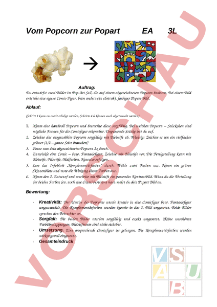 Vom Popcorn zur Popart EA 3L Auftrag: Du entwirfst zwei Bilder im PopArt Stil, die auf einem abgezeichneten Popcorn basieren. Bei einem Bild entsteht eine eigene ComicFigur, beim andern ein abstrakt, farbiges Popart Bild. Ablauf: (Schritt 1 kann zu zweit erledigt werden, Schritte 46 können auch abgetauscht werden) 1. Nimm eine handvoll Popcorn und betrachte diese sorgfältig. Bei welchen Popcorn – Stückchen sind mögliche Formen für die Comicfigur erkennbar. Unpassende Stücke isst du auf. 2. Zeichne das ausgewählte Popcorn sorgfältig mit Bleistift ab. Wichtig: Zeichne es um ein vielfaches grösser (1/2 – ganze Seite brauchen) 3. Pause nun dein abgezeichnetes Popcorn 2x durch. 4. Entwickle eine Comic – bzw. Fantasiefigur. Zeichne mit Bleistift vor. Die Fertigstellung kann mit Bleistift, Filzstift, Malfarben, Neocolor erfolgen. 5. Lese das Infoblatt „Komplementärfarben durch. Wähle zwei Farben aus. Nimm ein grünes Skizzenblatt und teste die Wirkung dieser Farben aus. 6. Nimm den 2. Entwurf und erarbeite mit Bleistift ein passendes Kontrastbild. Wenn du die Verteilung der beiden Farben (ev. noch eine dritte) bestimmt hast, malst du dein Popart Bild an. Bewertung: Kreativität: Der Umriss des Popcorns wurde kreativ in eine Comicfigur bzw. Fantasiefigur umgewandelt. Die Komplementärfarben wurden kreativ in das 2. Bild umgesetzt. Beide Bilder sprechen den Betrachter an. Sorgfalt: Die beiden Bilder wurden sorgfältig und exakt umgesetzt. (Keine unschönen Farbüberlappungen, Bleistiftreste sind nicht sichtbar. Umsetzung: Eine ansprechende Comicfigur ist gelungen. Die Komplementärfarben wurden wirkungsvoll eingesetzt. Gesamteindruck