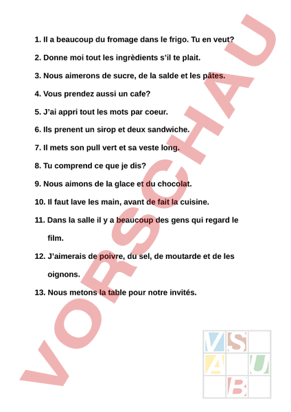 1. Il beaucoup du fromage dans le frigo. Tu en veut? 2. Donne moi tout les ingrèdients sil te plait. 3. Nous aimerons de sucre, de la salde et les pâtes. 4. Vous prendez aussi un cafe? 5. Jai appri tout les mots par coeur. 6. Ils prenent un sirop et deux sandwiche. 7. Il mets son pull vert et sa veste long. 8. Tu comprend ce que je dis? 9. Nous aimons de la glace et du chocolat. 10. Il faut lave les main, avant de fait la cuisine. 11. Dans la salle il a beaucoup des gens qui regard le film. 12. Jaimerais de poivre, du sel, de moutarde et de les oignons. 13. Nous metons la table pour notre invités.