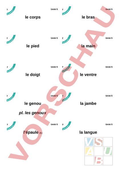 Unité 5 le corps Unité 5 le bras Unité 5 le pied Unité 5 la main Unité 5 le doigt Unité 5 le ventre Unité 5 le genou Unité 5 la jambe pl. les genoux Unité 5 lépaule (f.) Unité 5 la langue Unité 5 der Arm Unité 5 der Körper Unité 5 die Hand Unité 5 der Fuss Unité 5 der Bauch Unité 5 der Finger Unité 5 das Bein Unité 5 das Knie Unité 5 die Zunge auch die Sprache Unité 5 die Schulter Unité 5 la tête Unité 5 la bouche Unité 5 le front Unité 5 le nez Unité 5 Unité 5 loreille f. lœil (m.) pl. les yeux Unité 5 la joue Unité 5 le cheveu pl. les cheveux Unité 5 le visage Unité 5 le cou Unité 5 der Mund Unité 5 der Kopf Unité 5 die Nase Unité 5 die Stirn Unité 5 das Ohr Unité 5 das Auge Unité 5 das Haar Unité 5 die Wange Unité 5 der Hals Unité 5 das Gesicht Unité 5 la cheville Unité 5 le dos au dos Unité 5 Unité 5 laccident (m.) la foulure un accident une foulure Unité 5 Unité 5 la fracture le plâtre une fracture de plâtre Unité 5 Unité 5 avoir mal à faire mal jai mal fait mal Unité 5 Unité 5 grave m. et f. (adj.) la douleur pas grave des doleurs Unité 5 der Rücken Unité 5 der Knöchel Elle toujours mal est près du pied. Unité 5 Unité 5 die Verstauchung der Unfall du pied fait très mal. Pierre . de voiture. Unité 5 Unité 5 der Gips der Bruch Le médecin ne va pas mettre à Marianne. Il de la jambe. Unité 5 Unité 5 weh tun, schmerzen Schmerzen haben an Jai top travaillé. La tête me Aïe à la cheville. Unité 5 Unité 5 der Schmerz schlimm Le malade au dos. Laccident de Marianne nest Unité 5 Unité 5 lambulance (f.) fatigué –e (adj.) une ambulance est fatiguée Unité 5 Unité 5 la maladie la toux une maladie la toux Unité 5 Unité 5 tousser la gorge tousse la gorge Unité 5 Unité 5 malade (m. f. adj.) la santé est malade votre santé Unité 5 Unité 5 prendre froid la bronchite pris froid La bronchite Unité 5 Unité 5 müde die Ambulanz Elle à cause de la toux. Appelez Unité 5 Unité 5 der Husten die Krankheit Je prends du sirop contre Langine est de la gorge. Unité 5 Unité 5 der Hals, die Kehle husten Marc mal à , il met une écharpe. La malade beaucoup. Unité 5 Unité 5 die Gesundheit krank Pensez à , mangez des fruits! Marc ne va pas à lécole, il Unité 5 Unité 5 die Bronchitis sich erkälten est une maladie grave. Hier soir, jai Unité 5 Unité 5 le rhume langine (f.) le rhume une angine Unité 5 Unité 5 la pharmacie le comprimé la pharmacie ces comprimés Unité 5 Unité 5 les gouttes (f.pl.) la tisane gouttes la tisane Unité 5 Unité 5 le lit le repos au lit de repos Unité 5 lordonnance (f.) une ordonnance Unité 5 Assieds-toi Unité 5 die Angina Unité 5 der Schnupfen, die Erkältung Jai mal à la gorge, jai Quand jai , je prends des tisanes. Unité 5 Unité 5 die Tablette die Apotheke Prenez contre le rhume. Avec lordonnance, je vais prendre les médicaments à Unité 5 Unité 5 der (Kräuter-)Tee die Tropfen Ma mère me fait de , quand je suis malade. Prends dix dans un verre deau. Unité 5 Unité 5 die Ruhe, die Erholung das Bett Prenez un peu Quand on est malade, on reste Unité 5 Setz dich! Unité 5 das ärztliche Rezept Le médecin ma fait Unité 5 Asseyez-vous Unité 5 se laver Unité 5 shabiller Unité 5 se blesser se blesse Unité 5 se fouler qc. Unité 5 dessiner sest foulé Unité 5 Unité 5 se casser qc. sallonger sest pas cassé Allongez Unité 5 Unité 5 se soigner se mettre à faire qc. Soigne Mettez-vous Unité 5 sich waschen Unité 5 Setzten Sie sich! Unité 5 sich verletzen Unité 5 sich anziehen On facilement sur les pistes de ski. Unité 5 zeichnen Unité 5 sich etw. verstauchen Le sportif le pied. Unité 5 sich hinlegen, ausstrecken Unité 5 sich etwas brechen La sportive ne le pied. -vous sur le lit. Unité 5 beginnen mit . à travailler après la récréation. Unité 5 sich pflegen -toi, tu es malade.