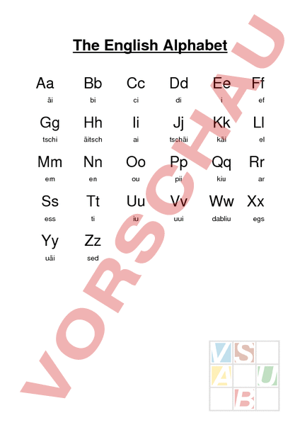 The English Alphabet Aa Bb Cc Dd Ee äi bi ci di Gg Hh Ii Jj Kk tschi äitsch ai tschäi käi Mm Nn Oo Pp Qq em en ou pii kiu Ss Tt Uu Vv ess ti iu uui Yy Zz uäi sed Ff ef Ll el Rr ar Ww Xx dabliu egs