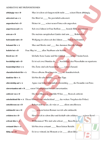 ADJEKTIVE MIT PRÄPOSITIONEN abhängig von D Max ist schon seit langem nicht mehr seinen Eltern abhängig. adressiert an A Der Brief ist Sie persönlich adressiert. angesehen bei D Heiner ist seiner neuen Firma sehr angesehen. angewiesen auf A Seit zwei Jahren ist Frau Steffens fremde Hilfe angewiesen. arm an D Die meisten europäischen Länder sind arm Rohstoffen. befreundet mit D Wolfgang ist schon seit drei Jahren Helene befreundet. bekannt für A Max und Moritz sind ihre dummen Streiche bekannt. beliebt bei D Frau May ist allen Nachbarn sehr beliebt. Bereit zu D Ich habe beste Laune und bin wirklich jedem Unsinn bereit. beschäftigt mit D Er ist seit zwei Stunden da beschäftigt, den Wasserhahn zu reparieren. beunruhigt über A Die Ärzte sind sehr beunruhigt seinen Zustand. charakteristisch für A Dieses alberne Benehmen ist sie charakteristisch. dankbar für A Ich bin dir sehr dankbar den Tipp. eifersüchtig auf A Agnes war früher unheimlich eifersüchtig die Freundin von Peter. einverstanden mit D euren Urlaubsplänen bin ich einverstanden. entfernt von D Die Insel Rügen ist ungefähr 80 km Rostock entfernt. entscheidend für A Dieser Hinweis war entscheidend das weitere Vorgehen der Polizei. entschlossen zu D Robert sieht so aus, als wäre er allem entschlossen. enttäuscht von D seinem letzten Roman war ich sehr enttäuscht. erfahren in D Herr Gosch ist schon älter und deshalb sehr erfahren seinem Beruf. erfreut über A Willkommen! Wir sind sehr erfreut Ihren Besuch. erstaunt über A Ich bin etwas erstaunt Ihren letzten Bericht. fähig zu D Er ist so wütend, im Moment er ist allem fähig.