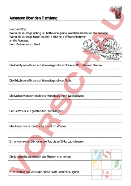 Aussagen über den Fischfang Lies die Sätze. Wenn die Aussage richtig ist, hefte eine grüne Wäscheklammer an die Aussage. Wenn die Aussage falsch ist, hefte eine rote Wäscheklammer an die Aussage. Dein Partner kontrolliert. Die Grizzlys ernähren sich überwiegend von Gräsern, Wurzeln und Beeren. Die Grizzlys ernähren sich überwiegend von Fisch. Die Lachse wandern mehrere Monate zu ihren Laichplätzen. Der Grizzly ist ein geschickter Lachsfänger. Meistens frisst er die Fische sofort im Wasser. Ein erwachsener Bär kann pro Tag bis zu 30 kg Lachs fressen. Die jungen Bären müssen das Fischen erst lernen. Zum Fischen brauchen die Bären Kraft und Schnelligkeit.