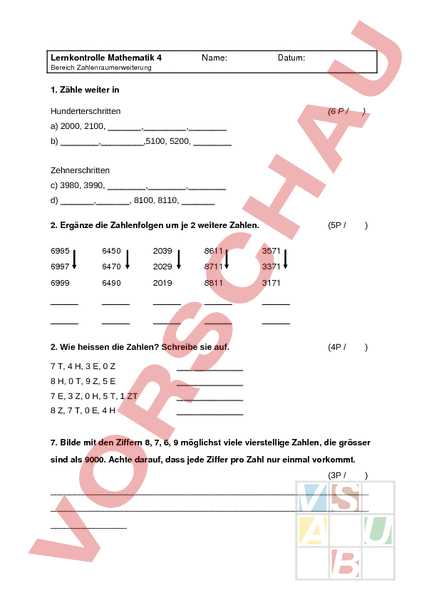 Lernkontrolle Zahlenraumerweiterung 10000, 4. Klasse