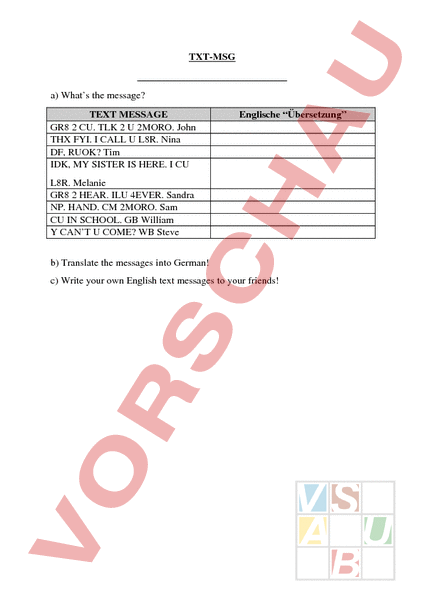 TXTMSG a) Whats the message? TEXT MESSAGE GR8 2 CU. TLK 2 2MORO. John THX FYI. CALL L8R. Nina DF, RUOK? Tim IDK, MY SISTER IS HERE. CU Englische Übersetzung L8R. Melanie GR8 2 HEAR. ILU 4EVER. Sandra NP. HAND. CM 2MORO. Sam CU IN SCHOOL. GB William CANT COME? WB Steve b) Translate the messages into German! c) Write your own English text messages to your friends! Geläufige Abkürzungen: • Einzelne Buchstaben können ganze Wörter ersetzen: b be c see r are u you y why • Zahlen können für Wörter eingesetzt werden: 8 ate 4 for 2 to or too • Zahlen und Buchstabenkombinationen: gr8great l8r later sk8 skate 2moro tomorrow b4 before 4ever forever • Buchstabenkombinationen: WB write back NP no problem WKD weekend BC because HF have fun GB Goodbye UR you are HAND have nice day IDK dont know ILU love you DF Dear friend CM call me MSG message JAM just minute THX thanks FYI for your information PLS please RUOK are you ok? TLK talk
