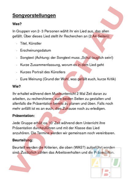 Songvorstellungen Was? In Gruppen von 2 3 Personen wählt ihr ein Lied aus, das allen gefällt. Über dieses Lied stellt ihr Recherchen an (2 A4 Seiten): Titel, Künstler Erscheinungsdatum Songtext (Achtung: der Songtext muss „Schultauglich sein!) Kurze Zusammenfassung, worum es in dem Lied geht Kurzes Portrait des Künstlers Eure Meinung (Grund der Wahl, was gefällt euch, kurze Kritik) Wie? Ihr erhaltet während dem Musikunterricht 2 Mal Zeit daran zu arbeiten, zu recherchieren, eure beiden Seiten zu gestalten und allenfalls die Präsentation bereits zu planen und üben. Falls noch mehr anfällt ist es an euch, dies Zuhause noch zu erledigen. Präsentation: Jede Gruppe erhält ca. 10‘ Zeit während dem Unterricht ihre Präsentation durchzuführen und mit der Klasse das Lied anzuhören. Die Termine werden wir gemeinsam noch vereinbaren. Beurteilung: Beurteilt werden die Kriterien, die oben (WAS?) aufgeführt worden sind. Zusätzlich zählen das Arbeitsverhalten und die Präsentation.