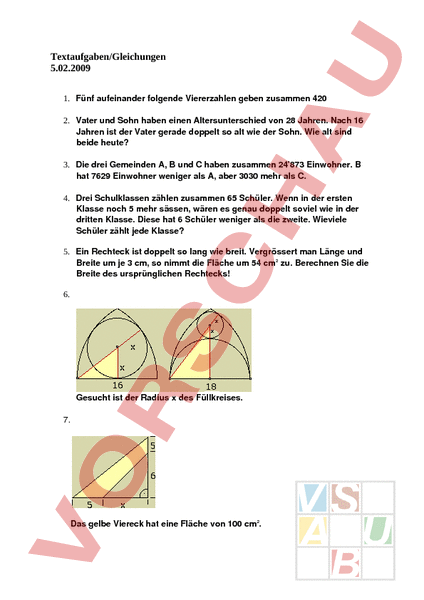 Textaufgaben/Gleichungen 5.02.2009 1. Fünf aufeinander folgende Viererzahlen geben zusammen 420 2. Vater und Sohn haben einen Altersunterschied von 28 Jahren. Nach 16 Jahren ist der Vater gerade doppelt so alt wie der Sohn. Wie alt sind beide heute? 3. Die drei Gemeinden A, und haben zusammen 24873 Einwohner. hat 7629 Einwohner weniger als A, aber 3030 mehr als C. 4. Drei Schulklassen zählen zusammen 65 Schüler. Wenn in der ersten Klasse noch 5 mehr sässen, wären es genau doppelt soviel wie in der dritten Klasse. Diese hat 6 Schüler weniger als die zweite. Wieviele Schüler zählt jede Klasse? 5. Ein Rechteck ist doppelt so lang wie breit. Vergrössert man Länge und Breite um je 3 cm, so nimmt die Fläche um 54 cm2 zu. Berechnen Sie die Breite des ursprünglichen Rechtecks! 6. Gesucht ist der Radius des Füllkreises. 7. Das gelbe Viereck hat eine Fläche von 100 cm2.