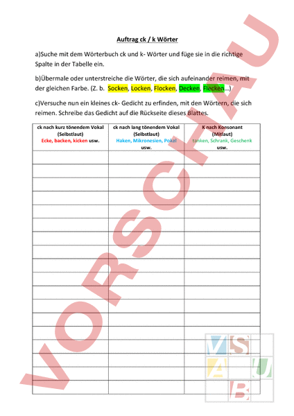 Die Kids sollen mit Hilfe des Wörterbuches ck und auch k Wörter suchen und in eine Tabelle eintragen. Gleich tönende mit derselben Farbe markieren und anschliessend ein Gedicht daraus erfassen.