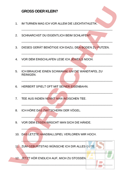 GROSS ODER KLEIN? 1. IM TURNEN MAG ICH VOR ALLEM DIE LEICHTATHLETIK. 2. SCHNARCHST DU EIGENTLICH BEIM SCHLAFEN? 3. DIESES GERÄT BENÖTIGE ICH DAZU, DEN BODEN ZU PUTZEN. 4. VOR DEM EINSCHLAFEN LESE ICH JEWEILS NOCH. 5. ICH BRAUCHE EINEN SCHWAMM, UM DIE WANDTAFEL ZU REINIGEN. 6. HERBERT SPIELT OFT MIT SEINER EISENBAHN. 7. TEE AUS INDIEN NENNT MAN INDISCHEN TEE. 8. ICH HÖRE DAS ZWITSCHERN DER VÖGEL. 9. VOR DEM ESSEN WÄSCHT MAN SICH DIE HÄNDE. 10. DAS LETZTE HANDBALLSPIEL VERLOREN WIR HOCH. 11. ZUM GEBURTSTAG WÜNSCHE ICH DIR ALLES GUTE. 12. JETZT HÖR ENDLICH AUF, MICH ZU STOSSEN. 13. ER FREUT SICH SO SEHR AUF DAS MUSIZIEREN. 14. IM RECHNEN BIST DU EINE PFEIFE. 15. DAS RÜTTELN MACHTE DIE KREUZSPINNE AUFMERKSAM. 16. VORGESTERN HATTE ICH DEN GANZEN MORGEN NICHTS ZU TUN. 17. BESTIMMT TRÄUMT WALTER NOCH VOM SÄGEN. 18. DIESER STEIN KOMMT AUS DEM HIMALAJA. 19. BEI MEINER TANTE GIBT ES SONNTAGS IMMER SCHOKOLADEKUCHEN. 20. SUSANNE BEKAM DIE STRAFAUFGABE FÜRS SCHWATZEN. 21. EIN EGOIST DENKT IMMER NUR AN SICH. 22. ZUM MITSPIELEN BRAUCHST DU NUR EINE GUTE LAUNE. 23. TROTZ DES GESCHREIS ERREICHST DU BEI MIR KEIN VERSTÄNDNIS. 24. ZUM KOCHEN BRAUCHT MAN KEINE KAPUTTE PFANNE. 25. ICH LEGE MICH NOCH EINE STUNDE AUFS OHR.
