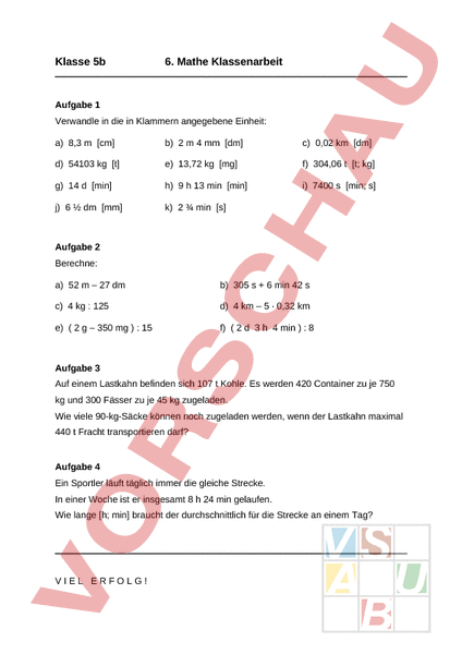 Klasse 5b 6. Mathe Klassenarbeit Aufgabe 1 Verwandle in die in Klammern angegebene Einheit: a) 8,3 [cm] b) 2 4 mm [dm] c) 0,02 km [dm] d) 54103 kg [t] e) 13,72 kg [mg] f) 304,06 [t; kg] g) 14 [min] h) 9 13 min [min] i) 7400 [min; s] j) 6 dm [mm] k) 2 min [s] Aufgabe 2 Berechne: a) 52 – 27 dm b) 305 6 min 42 c) 4 kg 125 d) 4 km – 5 · 0,32 km e) 2 – 350 mg : 15 f) 2 3 4 min : 8 Aufgabe 3 Auf einem Lastkahn befinden sich 107 Kohle. Es werden 420 Container zu je 750 kg und 300 Fässer zu je 45 kg zugeladen. Wie viele 90-kg-Säcke können noch zugeladen werden, wenn der Lastkahn maximal 440 Fracht transportieren darf? Aufgabe 4 Ein Sportler läuft täglich immer die gleiche Strecke. In einer Woche ist er insgesamt 8 24 min gelaufen. Wie lange [h; min] braucht der durchschnittlich für die Strecke an einem Tag? VIEL ERFOLG! Klasse 5b Lösungsvorschlag 6. Mathe Klassenarbeit Aufgabe 1 Verwandle in die in Klammern angegebene Einheit: a) 8,3 [cm] 830 cm b) 2 4 mm [dm] 20,04 dm c) 0,02 km [dm] 200 dm d) 54103 kg [t] 54,103 e) 13,72 kg [mg] 13 720 000 mg f) 304,06 [t; kg] 304 60 kg g) 14 [min] 14 · 24 · 60 min 20160 min h) 9 13 min [min] 553 min i) 7400 [min; s] 123 min 20 j) 6 dm [mm] 650 mm k) 2 min [s] 165 Aufgabe 2 Berechne: a) 52 – 27 dm 520 dm – 27 dm 493 dm 49,3 b) 305 6 min 42 305 402 707 11 min 47 c) 4 kg 125 4000 : 125 32 0,032 kg d) 4 km – 5 · 0,32 km 4 km – 1,6 km 2,4 km e) 2 – 350 mg : 15 ( 2000 mg – 350 mg : 15 1650 mg 15 110 mg f) 2 3 4 min : 8 3064 min 8 383 min 6 23 min Aufgabe 3 Auf einem Lastkahn befinden sich 107 Kohle. Es werden 420 Container zu je 750 kg und 300 Fässer zu je 45 kg zugeladen. Wie viele 90-kg-Säcke können noch zugeladen werden, wenn der Lastkahn maximal 440 Fracht transportieren darf? Rechnung: Kohle: 107 Container: 420 · 750 kg 315 000 kg 315 Fässer 300 · 45 kg 13 500 kg 13,5 Noch zuladen: 440 – 107 – 315 – 13,5 4,5 4500 kg Säcke: 4500 kg 90 kg 50 Antwort: Es können noch 50 Säcke zugeladen werden. Aufgabe 4 Ein Sportler läuft täglich immer die gleiche Strecke. In einer Woche ist er insgesamt 8 24 min gelaufen. Wie lange [h; min] braucht der durchschnittlich für die Strecke an einem Tag? Rechnung: In einer Woche: 8 24 min 504 min An einem Tag: 504 7 72 min 1 12 min Antwort: Der Sportler braucht durchschnittlich für die Strecke 1 12 min. www.klassenarbeiten.de Klasse 5b Tabelle zum Lernen Maßeinheiten