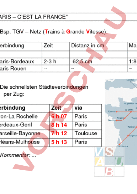 „PARIS – CEST LA FRANCE ZENTRALISMUS Bsp. TGV – Netz (Trains à Grande Vitesse): Verbindung Zeit Distanz in cm Massstab Distanz ParisBordeaux Paris Rouen 23 62.5 cm 1:800000 500 km . . . . Die schnellsten Städteverbindungen per Zug: Verbindung Zeit via LyonLa Rochelle 6 07 Paris BordeauxGenf 8 14 Paris MarseilleBayonne 7 12 Toulouse OrléansMulhouse 5 13 Paris Kommentar: .