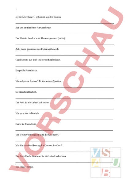 1 Jay ist Amerikaner – er kommt aus den Staaten. Ruf uns an mit deiner Antwort heute. Der Fluss in London wird Themse genannt. (heisst) Acht Leute gewannen den Ferienwettbewerb Carol kommt aus York und sie ist Engländerin. Er spricht Französisch. Woher kommt Ramon Er kommt aus Spanien. Sie sprechen Deutsch. Der Preis ist ein Urlaub in London. Wir sprechen italienisch. Carrie ist Journalistin. Von welcher Nationalität sind die Gewinner Was für eine Bevölkerung hat Greater London Der Preis für die Gewinner ist ein Urlaub in London. Der Fluss Themse. 2 Alexey kommt aus Russland. Alexey spricht Russisch. Emma kommt aus Schottland. Emma spricht schottisch. Ich bin Ramon und komme aus Spanien. Ramon ist Spanier – er kommt aus Spanien. Mein Name ist Kirstin und ich bin Schweizerin. Kirstin kommt aus der Schweiz. Leyla kommt aus der Türkei. Leyla spricht türkisch. Gewinne einen fantastischen Urlaub in London Das Foto zeigt die acht Gewinner des Wettbewerbs.