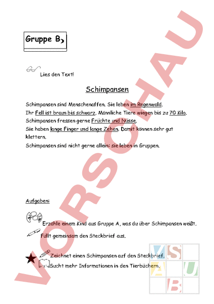 Gruppe Lies den Text! Schimpansen Schimpansen sind Menschenaffen. Sie leben im Regenwald. Ihr Fell ist braun bis schwarz. Männliche Tiere wiegen bis zu 70 Kilo. Schimpansen fressen gerne Früchte und Nüsse. Sie haben lange Finger und lange Zehen. Damit können sehr gut klettern. Schimpansen sind nicht gerne allein: sie leben in Gruppen. Aufgaben: Erzähle einem Kind aus Gruppe A, was du über Schimpansen weißt. Füllt gemeinsam den Steckbrief aus. Zeichnet einen Schimpansen auf den Steckbrief. Sucht mehr Informationen in den Tierbüchern.