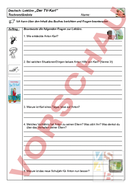 Deutsch: Lektüre „Der TV-Karl Textverständnis Name: Ich kann über den Inhalt des Buches berichten und Fragen beantworten Auftrag Beantworte die folgenden Fragen zur Lektüre. 1. Wie entdeckte Anton Karl? 2. Bei welchen Situationen/Dingen bekam Anton Hilfe von Karl? (Nenne 3!) 3. Warum ist Karl eines Tages böse auf Anton? 4. Welches Verhältnis hat Anton zu seinen Eltern? Was stört ihn? Was denkst du über das Verhalten seiner Eltern? 5. Warum ist das neue Schuljahr für Anton nun besser? 6. Was ist bei der Klogeschichte passiert? Von was hat Anton nun Angst? 7. Warum ist Anton wahrscheinlich keine Freunde? 8. Warum war der 20.11 ein sehr schlimmer Tag für Anton? 9. Was passiert mit Karl, wenn er zu lange aus dem Fernseher herauskommt? 10. Was macht die Oma um Karl zu retten und Anton zu helfen? 11. Was denkst du über den Schluss des Buch? Hättest du gleich gehandelt? 12. Hattest du schon ähnliche Erlebnisse oder Gefühle wie Anton?