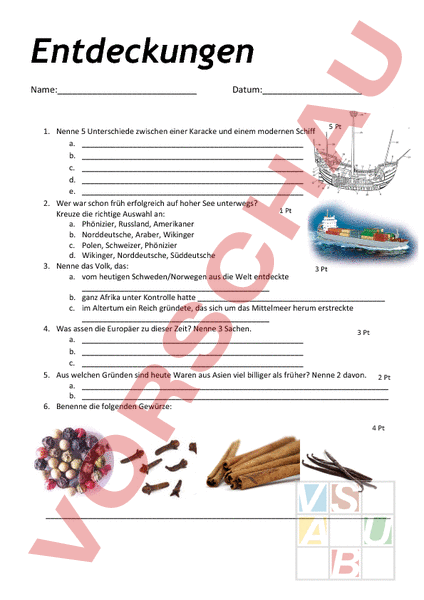 Entdeckungen Name: Datum: 5 Pt 1. Nenne 5 Unterschiede zwischen einer Karacke und einem modernen Schiff a. b. c. d. e. 2. Wer war schon früh erfolgreich auf hoher See unterwegs? 1 Pt Kreuze die richtige Auswahl an: a. Phönizier, Russland, Amerikaner b. Norddeutsche, Araber, Wikinger c. Polen, Schweizer, Phönizier d. Wikinger, Norddeutsche, Süddeutsche 3. Nenne das Volk, das: 3 Pt a. vom heutigen Schweden/Norwegen aus die Welt entdeckte b. ganz Afrika unter Kontrolle hatte c. im Altertum ein Reich gründete, das sich um das Mittelmeer herum erstreckte 4. Was assen die Europäer zu dieser Zeit? Nenne 3 Sachen. 3 Pt a. b. c. 5. Aus welchen Gründen sind heute Waren aus Asien viel billiger als früher? Nenne 2 davon. 2 Pt a. b. 6. Benenne die folgenden Gewürze: 4 Pt 7. Stell dir vor, du bist Portugiese ums Jahr 1450. Dein König braucht dringend Geld. Welche Idee könntest du haben um ihm Geld/Gold zu verschaffen? Nenne 2 Möglichkeiten: 2 Pt 8. Welche Erdteile sind zu dieser Zeit noch nicht bekannt? Nenne 4 davon. 4 Pt 9. Beschreibe, wie das Leben auf einer Karacke aussah 5 Pt 10. Schreibe auf, was du über 2 verschiedene Entdecker weisst. a. 3 Pt b. 3 Pt