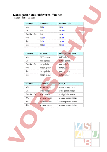 Konjugation des Hilfsverbs haben haben hatte gehabt PERSON PRÄSENS PRÄTERITUM Ich habe hatte Du hast hattest Er Sie Es hat hatte Wir haben hatten Ihr habt hattet Sie haben hatten PERSON PERFEKT PLUSQUAMPERFEKT Ich habe gehabt hatte gehabt Du hast gehabt hattest gehabt Er Sie Es hat gehabt hatte gehabt Wir haben gehabt hatten gehabt Ihr habt gehabt hattet gehabt Sie haben gehabt hatten gehabt PERSON FUTUR FUTUR II Ich werde haben werde gehabt haben Du wirst haben wirst gehabt haben Er Sie Es wird haben wird gehabt haben Wir werden haben werden gehabt haben Ihr werdet haben werdet gehabt haben Sie werden haben werden gehabt haben Konjugation des Hilfsverbs sein sein war gewesen PERSON PRÄSENS PRÄTERITUM Ich bin war Du bist warst Er Sie Es ist war Wir sind waren Ihr seid wart Sie sind waren PERSON PERFEKT PLUSQUAMPERFEKT Ich bin gewesen war gewesen Du bist gewesen warst gewesen Er Sie Es ist gewesen war gewesen Wir sind gewesen waren gewesen Ihr seid gewesen wart gewesen Sie sind gewesen waren gewesen PERSON FUTUR FUTUR II Ich werde sein werde gewesen sein Du wirst sein wirst gewesen sein Er Sie Es wird sein wird gewesen sein Wir werden sein werden gewesen sein Ihr werdet sein werdet gewesen sein Sie werden sein werden gewesen sein Konjugation des Hilfsverbs werden werden wurde geworden PERSON PRÄSENS PRÄTERITUM Ich werde wurde Du wirst wurdest Er Sie Es wird wurde Wir werden wurden Ihr werdet wurdet Sie werden wurden PERSON PERFEKT PLUSQUAMPERFEKT Ich bin geworden war geworden Du bist geworden warst geworden Er Sie Es ist geworden war geworden Wir sind geworden waren geworden Ihr seid geworden wart geworden Sie sind geworden waren geworden PERSON FUTUR FUTUR II Ich werde werden werde geworden sein Du wirst werden wirst geworden sein Er Sie Es wird werden wird geworden sein Wir werden werden werden geworden sein Ihr werdet werden werdet geworden sein Sie werden werden werden geworden sein