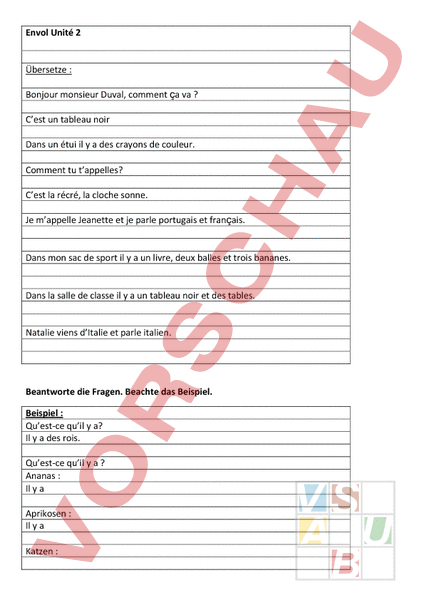 Envol Unité 2 Übersetze Bonjour monsieur Duval, comment ça va Cest un tableau noir Dans un étui il a des crayons de couleur. Comment tu tappelles? Cest la récré, la cloche sonne. Je mappelle Jeanette et je parle portugais et français. Dans mon sac de sport il a un livre, deux balles et trois bananes. Dans la salle de classe il a un tableau noir et des tables. Natalie viens dItalie et parle italien. Beantworte die Fragen. Beachte das Beispiel. Beispiel Quest-ce quil a? Il a des rois. Quest-ce quil a Ananas Il a Aprikosen Il a Katzen Geigen Bananen Radios Dans la salle de classe il a une porte Vervollständige den Befehlssatz prendre (du) (ihr) une gomme un cahier montrer (du) (ihr) un stylo un crayon venir au tableau noir ici (du) (ihr) regarder (du) (ihr) le chat le chat