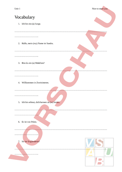 Unit 1 Nice to meet you Vocabulary 1. Ich bin ein (a) Junge. 2. Hallo, mein (my) Name ist Sandra. 3. Bist du ein (a) Mädchen? 4. Willkommen in Zweisimmen. 5. Ich bin erfreut, dich kennen zu (to) lernen. 6. Er ist von Polen. 7. Ist sie Engländerin?