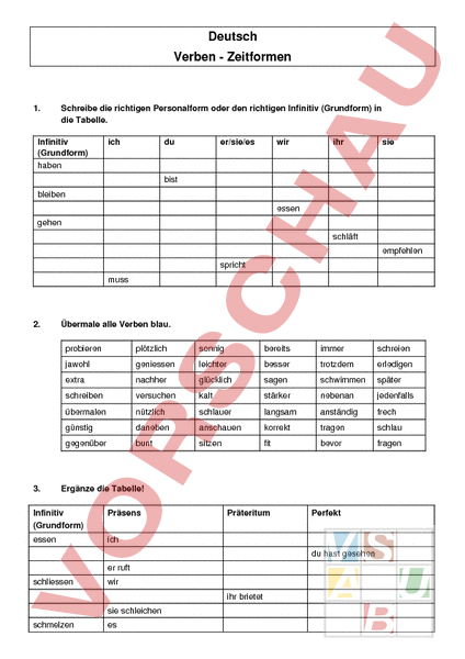 Deutsch Verben Zeitformen 1. Schreibe die richtigen Personalform oder den richtigen Infinitiv (Grundform) in die Tabelle. Infinitiv (Grundform) haben ich du er/sie/es wir ihr sie bist bleiben essen gehen schläft empfehlen spricht muss 2. 3. Übermale alle Verben blau. probieren plötzlich sonnig bereits immer schreien jawohl geniessen leichter besser trotzdem erledigen extra nachher glücklich sagen schwimmen später schreiben versuchen kalt stärker nebenan jedenfalls übermalen nützlich schlauer langsam anständig frech günstig daneben anschauen korrekt tragen schlau gegenüber bunt sitzen fit bevor fragen Präteritum Perfekt Ergänze die Tabelle! Infinitiv (Grundform) Präsens essen ich du hast gesehen er ruft schliessen wir ihr brietet sie schleichen schmelzen es er reitet 4. Verben erkennen. a) Unterstreiche die Verben, auch diejenigen, die in zwei Teile getrennt sind. b) Schreibe die Verben in der Grundform heraus. Die Knaben der Klasse stellen sich auf der Startlinie auf. Gespannt und in geduckter Haltung stehen sie bereit. Der Startpfiff ertönt. Die Knaben werfen sich nach vorn. Mit kurzen, schnellen Schritten gehen sie in die Kurve. Zuvorderst läuft Martin, hinter ihm liegt Hans. Auch Max löst sich vom Feld und beschleunigt das Tempo. Zuhinterst rennt Benni mit stark angewinkelten Armen und seitwärts geneigtem Kopf. Sein Gesicht rötet sich vor Anstrengung. Martin zieht ruhig seine Bahn. Er schüttelt seine Verfolger ab. Seine Schritte werden länger, gleichmässiger, der Abstand vergrössert sich. Die Klassenkameraden, die den Lauf aufgeregt verfolgen, jubeln ihm zu, feuern ihn an. Noch zwei Runden sind zu laufen. Hält Martin wohl durch? 5. Setze die passenden Verben aus dem Kästchen im Präsens und im Präteritum ein Präsens Präteritum Papa das Auto mit dem Schlauchboot. Papa das Auto mit dem Schlauchboot Wir an den See. Wir an den See. Mein Bruder das Boot auf. Mein Bruder das Boot auf. Gemeinsa wir das Boot zum Wasser. Gemeinsam wir das Boot zum Wasser. Wir uns vom Ufer ab. Wir uns vom Ufer ab. Der Hund im Wasser. Der Hund im Wasser. Danach wir an der Sonne. Danach wir an der Sonne. Ich nicht nach Hause gehen. Ich nicht nach Hause gehen. schwimmen, fahren, legen, blasen, tragen, mögen, stossen, beladen 6. Setze das Verb in der Klammer ins Präteritum. Die Besucherin (bringen) einen Blumenstrauss. 7. Tom (fahren) den ganzen Weg ohne Licht. Die Schweizer SkiNati (gewinnen) keine Medaille. Die Gäste (essen) die Pommes mit den Händen. Das (gehen) voll daneben. Der Mann (halten) zu seiner Frau. Die Lehrer (sprechen) nur Gutes über diese Schülerin. Wir (lesen) den Roman bis zur letzten Seite. Du (stehen) auf der anderen Strassenseite. Das Opfer (rufen) laut um Hilfe. Weshalb (tragen) die Schauspieler Masken? Die Kandidaten (wissen) alle Antworten. Das Kind (mögen) das Eis nicht. Die Schülerin (vergessen) ihre Hausaufgaben. Die strenge Lehrerin (ziehen) ihre Schlüsse daraus. Kurt (sitzen) neben Paul und Ingrid. Setze die verbalen Wortketten in die vorgegebene Zeitform. auf den Boden fallen 1. Pers. Sg. Präteritum am ganzen Körper frieren 1. Pers. Pl. Perfekt einander tatkräftig helfen 3. Pers. Pl. Präteritum auf einen Hügel klettern 3. Pers. Pl. Perfekt einen Ball hochwerfen 2. Pers. Sg. Präteritum immer die Hausaufgaben vergessen 2. Pers. Sg. Präsens mit dem Fahrrad abbiegen 2. Pers. Pl. Perfekt am langsamsten springen 3. Pers. Sg. weiblich, Präteritum 8. im eiskalten See schwimmen 3. Pers. Pl. Präteritum meine Sonnenblume giessen 1. Pers. Sg. Perfekt zwanzig Lieder singen 1. Pers. Pl. Präteritum an der Rose riechen 3. Pers. Sg. männlich, Perfekt Übermale die Verben blau! Umzug im Schulhaus Wegen Renovationsarbeiten zieht die Klasse in ein anderes Schulzimmer um. Die Kinder packen kräftig zu. Keuchend versucht Diego ganz alleine einen Bücherschrank durch den Korridor zu schieben. Der Lehrer eilt aufgeregt herbei und schimpft. „Mark sollte dir doch bei dieser schweren Arbeit helfen. „Das tut er auch, Herr Bodenmann. Er sitzt nämlich im Schrank und hält die Gestelle fest, damit sie nicht herunterfallen. 9. In welcher Zeit stehen die Sätze? Unterstreiche zuerst das Verb! Er stand den ganzen Tag vor der Türe. Hier sitzt der Grossvater des Freundes. Hat er die Sterne wirklich genau gesehen. Morgen gehe ich mit der Mutter ins Kino. Im nächsten Jahr werde ich besser zuhören. Sie war ganz traurig. Der Samichlaus erschrak hinter dem Tannenbaum. Wir sind alle über das Loch gesprungen. Hatte er die Geschichte nicht gehört? 10. Setze das angegebene Verb am Schluss des Satzes in die richtige Form. schreien Das Kind hat fürchterlich auslaufen Alles Öl ist aus dem Fass betten Das Kind hat die Puppe weich anpreisen Der Zauberer hat seine Nummer laut senken Man hat den Sarg ins Grab rennen Hans ist gestern nach Hause 11. Schule sinken Das Schiff ist im Sturm sieden Ich habe die Eier drei Minuten anrufen Gestern hat mich ein fremder Mann bringen Wir haben Omi einen Blumenstrauss Ergänze im Perfekt. Barbara kommt ohne Regenschirm Heim. Das vergessliche Mädchen ihn in der (lassen). Vor dem Umzug hat Frau Keller alle Hände voll zu tun. Es dauert lange, bis sie alles (einpacken). Hans findet plötzlich seine Spielsachen nicht mehr. Die Mutter sein Zimmer gründlich (aufräumen). Monika vor der Deutschprüfung noch einmal die Kommaregeln (durchgehen). Endlich kann Frau Frei die neuen Vorhänge nähen. Der Pöstler ihr den Stoff (bringen). Wir stehen bis zu den Knöcheln im Wasser. Der Fluss wieder einmal über die Ufer (treten). Wir gestern im Restaurant Schwanen Kegel (schieben).