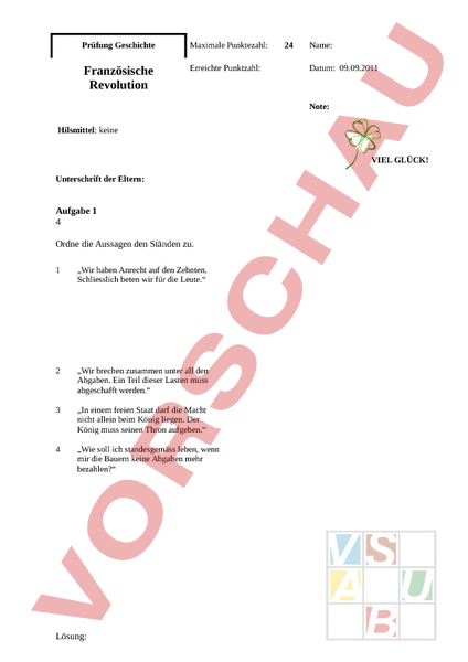 Arbeitsblatt: Französische Revolution, Prüfung