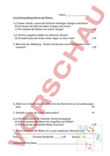 Name: Geschichtsprüfung Kelten und Römer 1 a) Nenne Gründe, warum die Helvetier befestigte Anlagen errichteten? b) Wo bauten die Helvetier diese Anlagen und wieso? c) Wie nannten die Römer eine solche Anlage? 2.5P 2 a) Welche Aufgaben erfüllte ein keltischer Druide? b) Weshalb hatten die Kelten keine Angst vor dem Tode? 1.5P 3. Betrachte die Abbildung Welche Handwerke waren im Oppidum wohl vertreten? 1.5P 4. Zähle zwei Gründe auf, weshalb es bei den Helvetiern zu Auswanderungen kam. 2P 5. Weshalb wurden die Kelten unterworfen? 1P 6 a) Wie funktionierte die römische Wasserversorgung? b) Wie alarmierten die Römer bei Angriffen das Militär? c) Wer durfte die öffentlichen Bäder besuchen? 1.5P 7. Wieso brauchten die Römer ein so gut ausgebautes Strassennetz? 2P ------------------------------------------------------------------------------------------------Note: Erreichte Punktzahl:/12P Klassen – : Unterschrift der Eltern: