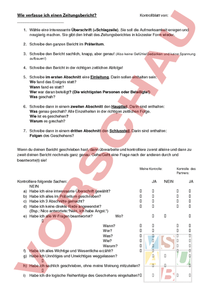 Wie verfasse ich einen Zeitungsbericht? Kontrollblatt von: 1. Wähle eine interessante Überschrift (Schlagzeile). Sie soll die Aufmerksamkeit erregen und neugierig machen. Sie gibt den Inhalt des Zeitungsberichtes in kürzester Form wieder. 2. Schreibe den ganzen Bericht im Präteritum. 3. Schreibe den Bericht sachlich, knapp, aber genau! (Also keine Gefühle/Gedanken und keine Spannung aufbauen!) 4. Schreibe den Bericht in der richtigen zeitlichen Abfolge! 5. Schreibe im ersten Abschnitt eine Einleitung. Darin sollen enthalten sein: Wo fand das Ereignis statt? Wann fand es statt? Wer war daran beteiligt? (Die wichtigsten Personen oder Beteiligte!) Was geschah? 6. Schreibe dann in einem zweiten Abschnitt den Hauptteil. Darin sind enthalten: Was genau geschah? Alle Einzelheiten in der richtigen zeitlichen Folge. Wie ist es geschehen? Warum es geschah? 7. Schreibe dann in einem dritten Abschnitt den Schlussteil. Darin sind enthalten: Folgen des Geschehens? Wenn du deinen Bericht geschrieben hast, dann überarbeite und kontrolliere zuerst alleine und dann zu zweit deinen Bericht nochmals ganz genau. Gehe/Geht eine Frage nach der anderen durch und beantworte(t) sie! Meine Kontrolle: Kontrolliere folgende Sachen: NEIN a) Habe ich eine interessante Überschrift gewählt? b) Habe ich alles im Präteritum geschrieben? c) Habe ich 3 Abschnitte gemacht? d) Habe ich keine direkte Rede angewendet? (Bsp.: Nico antwortete:Nein, ich habe Angst.) e) Habe ich alle WFragen beantwortet? Wo? Wann? Wer? Was? Wie? Warum? f) Habe ich alles Wichtige und Wesentliche erzählt? g) Habe ich Unnötiges und Unwichtiges weggelassen? h) Habe ich sachlich geschrieben, ohne meine Meinung mitzuteilen? i) Habe ich die logische Reihenfolge des Geschehens eingehalten? JA Kontrolle des Partners: NEIN JA j) Habe ich Wörter im Rechtschreibeduden gesucht und verbessert? k) Habe ich verschiedene Wörter verwendet? l) Habe ich die Sätze verschieden aufgebaut? (Bsp.: Nico sass auf der Bank. Er las ein Buch. Er schaute hinaus. Er sah Jule. Er beobachtete, wie die Jungs Jule schlugen. Er hatte Angst. Er) Wenn du alles mit JA beantworten kannst, dann darfst du deinen Entwurf abgeben.