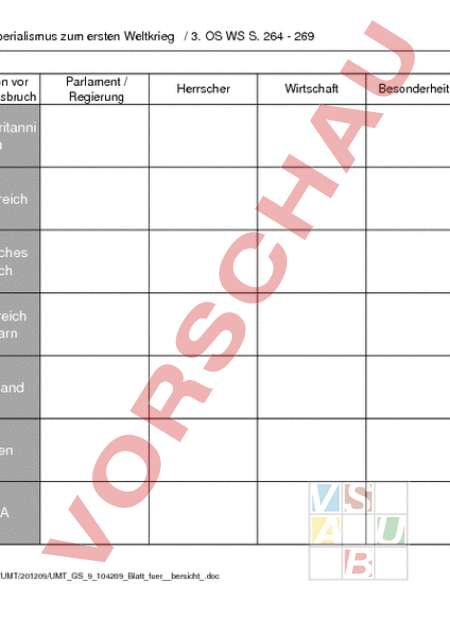 Vom Imperialismus zum ersten Weltkrieg 3. OS WS S. 264 269 Situation vor Kriegsausbruch Parlament Regierung Herrscher Grossbritanni en Frankreich Deutsches Reich Österreich Ungarn Russland Italien USA /home/bildpf/UMT/201209/UMT_GS_9_104209_Blatt_fuerbersicht_.doc Wirtschaft OS Raron seg Besonderheiten Parteien Tendenz