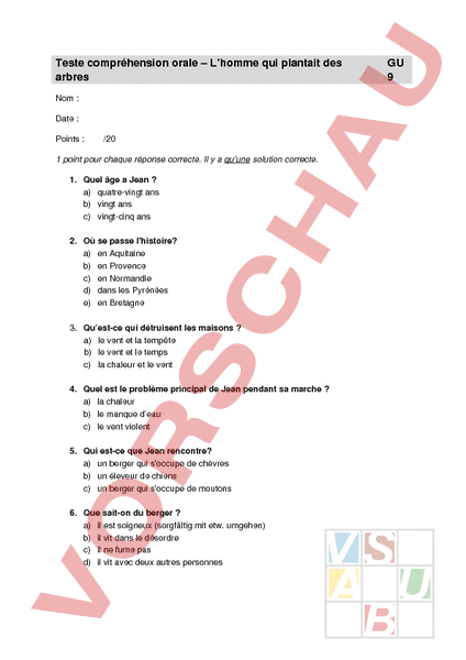 Teste compréhension orale – Lhomme qui plantait des arbres Nom Date Points /20 1 point pour chaque réponse correcte. Il a quune solution correcte. 1. Quel âge Jean a) quatrevingt ans b) vingt ans c) vingtcinq ans 2. Où se passe lhistoire? a) en Aquitaine b) en Provence c) en Normandie d) dans les Pyrénées e) en Bretagne 3. Questce qui détruisent les maisons a) le vent et la tempête b) le vent et le temps c) la chaleur et le vent 4. Quel est le problème principal de Jean pendant sa marche a) la chaleur b) le manque deau c) le vent violent 5. Qui estce que Jean rencontre? a) un berger qui soccupe de chèvres b) un éleveur de chiens c) un berger qui soccupe de moutons 6. Que saiton du berger a) il est soigneux (sorgfältig mit etw. umgehen) b) il vit dans le désordre c) il ne fume pas d) il vit avec deux autres personnes GU 9 7. Qui mène les moutons jusquà lendroit où il a de lherbe a) personne b) Jean et le chien c) les moutons ont un GPS d) le berger e) le chien, le berger et Jean 8. Que saiton de Jean? a) il fume la pipe b) il fume des cigarettes c) il fume des cigares 9. Que fait le berger le soir pendant que lauteur fume a) il compte des glands jusquà ce quil trouvé 50 glands de bonne qualité b) trier des glands cest un jeu pour lui c) il trie des glands quil plantera plus tard 10. Pourquoi le berger ne marchetil pas avec un bâton ou une canne de bois a) il nen pas besoin b) il utilise une tige (Stange) de fer qui lui permet de planter ses glands c) il toujours une tige de fer pour faire fuir les loups 11. Combien darbres le berger atil plantés en trois ans a) dix mille b) cent mille c) vint mille 12. Que saiton du berger a) il sappelle Elzéamar Boufferer b) il est veuf (Witwer) c) il était employé dans une ferme avant dêtre berger 13. Pourquoi estce que le berger plante des arbres a) il na rien dautre à faire b) il est propriétaire de ce terrain c) il remarqué que la région était en train de mourir 14. Pourquoi personne « den bas » ne remarquait le changement du paysage a) il ny avait personne qui visitait ce paysage b) à cause de la lenteur c) parce que cétait un réservoir naturelle et cétait interdit à entrer 15. Questce qui est différent quand Jean revient quelques années plus tard a) rien na changé b) la forêt commencé à grandir c) il a du brouillard 16. Quelle espèce darbre na pas réussi à pousser a) les hêtres b) des pins c) les chênes d) les bouleaux 17. Pourquoi, à la deuxième rencontre, le berger natil presque plus de moutons a) ils sont morts b) il les vendus pour gagner de largent c) il les vendus car il craignait quils mangent les jeunes pousses darbres 18. Quelle est lautre passion du berger a) il fait des sculptures b) il élève des abeilles c) il élève des lapins 19. Pourquoi des gardes forestiers, des techniciens et des hommes politiques sont venus dans la région? a) pour ouvrir une station de recherche biologique b) à cause de la forêt plantée par le berger c) pour féliciter le berger de son bon travail 20. Quelle leçon nous donne cette histoire? a) il faut vivre près de la nature b) il faut protéger la nature pour les générations futures c) il faut vivre de manière solitaire pour être heureux