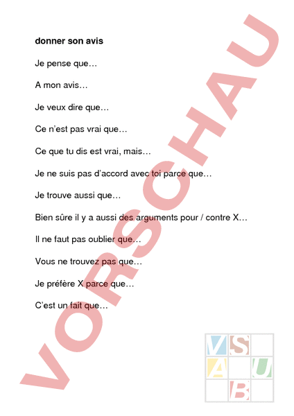 donner son avis Je pense que mon avis Je veux dire que Ce nest pas vrai que Ce que tu dis est vrai, mais Je ne suis pas daccord avec toi parce que Je trouve aussi que Bien sûre il a aussi des arguments pour contre X Il ne faut pas oublier que Vous ne trouvez pas que Je préfère parce que Cest un fait que en ville les gens sont pressés cest pollué cest bruyant il a beaucoup de choses à faire il a beaucoup de théâtres il a beaucoup de cinémas les gens ne sintéressent pas aux autres il a beaucoup de pauvreté on ne connaît pas les voisins cest dangereux à cause de la circulation il a beaucoup de pollution il a des gaz toxiques dans lair cest dangereux de se promener à vélo il a plus de drogues cest plus chère cest plus proche pour aller au travail à la campagne il ny pas de vie privé; tout le monde sait tout sur les voisins on peut faire des marches dans les prés dans la fôret on peut se promener dans le village dans les rues ny pas beaucoup de circulation les gens saident les uns les autres on nest pas très stressé lair est pur on peut se promener à vélo il a moins de pauvreté quen ville il fait moins chaud en été il a plus de neige en hiver on peut faire plus de sport cest plus difficile de connaître les gens la vie est plus saine il a moins de risque dêtre au contacte avec les drogues cest moins chère cest plus loin pour aller au travail les arguments: en ville ou à la campagne on peut se promener à vélo les gens sont pressés lair est pur il a beaucoup de choses à faire cest pollué il a beaucoup de théâtres cest dangereux de se promener à vélo il a plus de drogues dans les rues ny pas beaucoup de circulation on peut faire plus de sport il ny pas de vie privé; tout le monde sait tout sur les voisins cest plus difficile de connaître les gens la vie est plus saine il a moins de risque dêtre au contacte avec les drogues il a beaucoup de pauvreté on ne connaît pas les voisins il a des gaz toxiques dans lair il a moins de pauvreté quen ville il fait moins chaud en été il a plus de neige en hiver cest bruyant les gens saident les uns les autres on nest pas très stressé cest plus proche pour aller au travail cest dangereux à cause de la circulation il a beaucoup de cinémas cest plus chère on peut faire des marches dans les prés dans la fôret on peut se promener dans le village il a beaucoup de pollution cest moins chère les gens ne sintéressent pas aux autres cest plus loin pour aller au travail