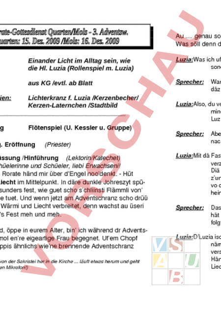 2 Au genau so, wie diä Frau, hät sie ungfähr uusgsieh. Was söll denn das bedüüte uf dim Chopf? Thema: Einander Licht im Alltag sein, wie die Hl. Luzia (Rollenspiel m. Luzia) Luzia:Was ich ufem Chopf träg, isch kei Adventschranz, sondern en Liechterchranz. Lieder: aus KG /evtl. ab Blatt Sprecher: Materialien: Lichterkranz f. Luzia /Kerzenbecher/ Kerzen-Laternchen /Stadtbild 1. Einzug Flötenspiel (U. Kessler u. Gruppe) 2. Liturg. Eröffnung Luzia:Also, du verstohsch jo gar nüd! Das hät doch met minem Namenstag ztue . mit em Tag vo dä Heilige Luzia, . mit em 13. Dezember! Sprecher: (Priester) 3. Begrüssung /Hinführung (Lektorin/Katechet) Liebi Schüelerinne und Schüeler, liebi Erwachseni! Im letzte Rorate händ mir über dEngel noodenkt. Hüt stoht sLiecht im Mittelpunkt. In däre dunkle Johreszyt spü ret mir bsunders fest, wie guet scho schliinsti Flämmli von re Cherze tuet. Und wenn jetzt am Adventschranz scho drüü Flamme Wärmi und Liecht verbreitet, denn wachst au üseri Freud ufs Fest meh und meh. Als Chind, öppe in eurem Alter, bin ich während dr Advents zyt au emol enre eigeartige Frau begegnet. Ufem Chopf hät sie öppis ähnlichs wiene brennende Adventschranz treit. (Luzia tritt von der Sakristei her in die Kirche . läuft etwas herum und geht zum flexiblen Mikrofon!) Warum treisch denn dä uf dim Chopf und häsch däzue noch es Nachthemd aa? Aber, . dFasnacht chunnt doch erst noch dä Wieh nacht? Oder, han ich jetzt es ‚Gnuusch? Luzia:Mit dä Fasnacht hät das überhaupt nüd ztue. Ich verzehl dir churz mini Gschicht. Diä Heilig Luzia hät öppe vor 1700 Johr gläbt, zunderst in Italie, in Sizilie. Zu däre Zyt sind dChriste vo dä römische Kaiser verfolgt worde . und händ heimlich müesse Gottesdienst fiire. Sprecher: Das tönt jo würklich sehr spannend .! Jo, und was hät denn diä Heilig Luzia mit däne Christe, wo ver folgt worde sind, ztue? Luzia:DLuzia isch ganz muetigi Frau gsi. DLuzia hät nämli dChriste, wo sich in dunkle Gäng händ müesse verstecke, mit zEsse versorgt. Und dämit sie beidi Händ frei gha hät, hät sie sich in dr Dunkelheit en Liechterchranz uf dä Chopf gsetzt, wo ihre ghulfe hät, dä Weg besser zgfinde. Sprecher: 3 Das tönt würklich vonre ghörige Portion Muet . und jetzt wird mir au immer meh bewusst, warum dä Name ‚Luzia jo ‘die Leuchtende heisst! Luzia:Jo, das stimmt, . wil dLuzia für all diä Mensche, wo sich händ müesse verstecke, shoffnigsvolli Liecht gsi isch, heisst sie au ‚die Leuchtende. Und häsch das au scho ghört: In Schwede tuet diä ältesti Tochter vonre Familie am 13. Dezember dRolle vo dä Heilige Luzia übernäh . und bringt dä Lüüt in dä Hüüser gsegnets, süesses LuziaBrot. Sprecher: Das isch würklich en schöne Bruuch. Gueti Wünsch und süesses Brot chömmed bi dä Lüüt sicher au guet aa. ‚Freud schenke hät jo au öppis mit Liecht verschenke ztue! Drum säget mir doch au: ‚Öppert strahlt vor Freud! oder ‚DAuge vo Öppertem lüüchtet vor Glück! Do isch üs diä Heilig Luzia würklich es Vorbild. 4. Kurzes Flötenspiel ( kann auch nochmals dasselbe wie zu Beginn sein!!!) 5. Überleitung zum Bussakt Schön spannend . diä Gschicht vo dä Heilige Luzia. Öb echt mir während dä vergangene Adventstäg au so vorbildlichi ‚Liechtträgerinne und ‚Liechtträger gsi sind. Tüend mir doch churz drüber im Buessakt noodenke. 4 6. Bussakt /Besinnung (3 Kinder) DLuzia isch muetigi Frau gsi. Wie muetig bin ich? Chann ich mii für öppert iisetze, wo vo anderne fertig gmacht wird? Herr, erbarme dich unser Christus, erbarme dich unser (wird alles gesungen!) Herr, erbarme dich unser DLuzia isch helfendi Frau gsi. Wo han ich anderne ghulfe und ihne so echli ‚Liecht im Alltag gschenkt? Herr, erbarme dich unser Christus, erbarme dich unser (wird alles gesungen!) Herr, erbarme dich unser DLuzia isch lüüchtendi Frau gsi. Wen han ich in däne Tag vor luuter Freud zum Strahle broocht? Herr, erbarme dich unser Christus, erbarme dich unser (wird alles gesungen!) Herr, erbarme dich unser 7. Vergebensbitte Liebe Gott . wo mir dinem Liecht im Weg gstande sind . und enand in ‚Schatte gstellt händ, bittet mir um dis Erbarme . im Name vom Vater, vom Sohn und vom Heilige Geist. 8. Tagesgebet Guete Gott, diä Heilig Luzia isch üs es grosses Vorbild im Verschenke vo Liebi und Liecht. Grad in däre erwartigsfrohe Zyt, wo mir üs scho so fest ufs grossi Fest freuet, chönnd mir enand au viel Liecht und Liebe schenke. Dass üs das guet glingt, drum bittet mir, dur Jesus, üseren Retter und Heiland. Amen. 5 9. Kurze Überleitung zur Lesung Mengisch gits Träum, wo Angst machet, . mengisch au Träum, wo sHerz glücklich machet. Wenn dr Prophet Jesaja in dr Lesig vomne helle Liecht redt, denn empfindet das dZuehörer, wo 700 Johr vor Christus im Land Juda under dr Bsetzig dur dAssyrer liidet, sicher als en willkommene Tag traum: 10. Lesung aus dem Buch Jesaja (Jes 60, 1 3) Steh auf, Zion, hör auf zu trauern, lass dein Gesicht vor Freude strahlen; denn dein Licht kommt zu dir. Die Herrlichkeit des Herrn leuchtet über dir wie die Sonne. Über anderen Völkern der Erde liegt Dunkelheit; doch über dir strahlt das Licht des Herrn, der Glanz seiner Gegenwart wird über dir sichtbar. Die Völker werden von deinem Licht angezogen, und die Könige wollen den Glanz sehen, in dem du strahlst. Wort des lebendigen Gottes 11. Antwortgesang KG 299 (1. 3. Str.) ‚Wir sagen euch an den lieben Advent . 6 12. Aus dem hl. Evangelium n/Matthäus (Mt 5, 14 16) Einmal sagte Jesus zu den vielen Menschen, die ihm zu hörten: „Ihr seid das Licht der Welt. Eine Stadt, die auf einem Berg liegt, kann nicht verborgen bleiben. Man zündet auch nicht ein Licht an und stülpt ein Gefäss darüber, sondern man stellt es auf den Leuchter; dann leuchtet es allen im Haus. So soll euer Licht vor den Menschen leuchten, damit sie euren guten Werke sehen und euren Vater im Himmel preisen. Evangelium unseres Herrn Jesus Christus 13. 