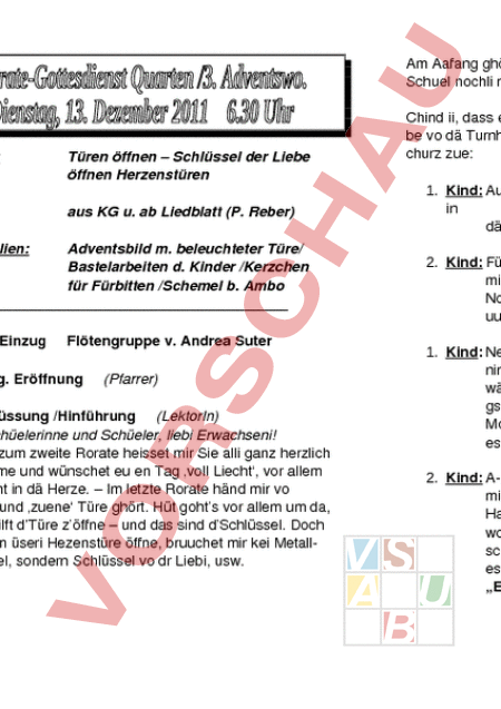Thema: Lieder: Türen öffnen – Schlüssel der Liebe öffnen Herzenstüren aus KG u. ab Liedblatt (P. Reber) Materialien: Adventsbild m. beleuchteter Türe/ Bastelarbeiten d. Kinder /Kerzchen für Fürbitten /Schemel b. Ambo 1. Zum Einzug Flötengruppe v. Andrea Suter 2. Liturg. Eröffnung (Pfarrer) 3. Begrüssung /Hinführung (LektorIn) Liebi Schüelerinne und Schüeler, liebi Erwachseni! Au hüt, zum zweite Rorate heisset mir Sie alli ganz herzlich willkomme und wünschet eu en Tag ‚voll Liecht‘, vor allem au Liecht in dä Herze. – Im letzte Rorate händ mir vo ‚offene‘ und ‚zuene‘ Türe ghört. Hüt gohts vor allem um da, wo üs hilft dTüre zöffne – und das sind dSchlüssel. Doch halt, zum üseri Hezenstüre öffne, bruuchet mir kei Metall schlüssel, sondern Schlüssel vo dr Liebi, usw. Am Aafang ghöret mir, wie zwei Chind ufem Heiweg vo dr Schuel nochli mitenand schwätzet. Plötzlich fallt em einte 2 Chind ii, dass es nochem Turne dr Schlüssel in dr Gardero be vo dä Turnhalle vergesse hät. Loset mir däm Gspröch churz zue: 1. Kind: Au jetzt han‘ ich dr Schlüssel vo dr Huustür in dä Garderobe vergesse. 2. Kind: Für was nimmsch denn du dr Schlüssel immer mit in dSchuel? – Isch denn bi dir jewils am Nomittag niemert dihei, wenn du dSchuel uushäsch? 1. Kind: Nei , leider isch ebe niemert dihei. – Drum nimm ich dr Schlüssel immer mit. – Weisch, ich wär froh, es wär andersch, aber sMami hät gseit, wenn sie nüd au no es paar halbi Täg im Monet go schaffe göng, chönned sie üs chumm es Gschenk uf Wiehnachte kaufe. 2. Kind: Apropos ‚Gschenk‘ do fallt mir grad ii, was mini Schwöster vor es paar Täg gseit hät: In dä Handarbeit tüegets Schlüsselaahänger bastle, wo sie denn an Wiehnachte dörfet dä Lüüt ver schenke und an dä Schlüsselaahänger hegs es Chärtli mit em Text: „Es Gschenk für Sie es isch zwor chlii! Doch han‘ ichs selber gmacht, und schenks dir drum uf dWiehnacht. 3 4. Überleitung zum Bussakt (LektorIn) Jo, selber gmachti Gschenk, das wüsset mir alli, sind oft viel wertvoller, als tüüri Gschenk vo dä Warehüüser. – Aber Gschenk müend jo nüd immer ‚handfest‘ und ‚sichtbar‘ sii. Scho es fründlichs Wort chann doch es wertvolls Gschenk sii. Im Buessakt wänd mir churz dodrüber noodenke und Gott um sis Erbarme bitte, grad dört, wo mir mit däne Herzens gschenk ‚gspaart‘ händ: 5. Bussakt /Besinnung (drei Kinder) Lieber Gott, du weisst, wie wir einander Freude machen können, vor allem, wenn wir einander ‚Herzensgeschenke‘ machen. Verzeih‘ uns, wenn wir in den letzten Tagen manchmal sagten: ‚Ich ha jetzt kei Zyt!‘ Lied KG 70 ‚Kyrie eleison ‘ Lieber Gott, du weisst, wie wir einander Trost schenken können, vor allem, wenn uns die Mitmenschen nicht egal sind. Verzeih‘ uns, wenn wir mit aufmunternden Worten sparten. Lied KG 70 ‚Kyrie eleison ‘ Lieber Gott, du weisst, wie wir einander Licht und Wärme schenken können, vor allem, wenn wir unser ‚Herz‘ öffnen und einander helfen. Verzeih‘ uns, wenn wir oft nur an uns selber dachten. Lied KG 70 ‚Kyrie eleison ‘ 4– 6. Vergebungsbitte (Pfarrer) Guter Gott, verzeih‘ uns, wo wir hartherzig waren, wo wir deine Liebe und dein Licht nicht weiterschenkten im Namen des Vaters, und des Sohnes und des heiligen Geistes Amen. 7. Tagesgebet Lichtschenkender Gott, In diesen Vorbereitungstagen auf Weihnachten sind wir eingeladen, einander mit ‚Schlüsseln der Liebe‘ die Herzenstüren zu öffnen. Rüttle uns wach, dass wir Zeit füreinander haben. Dann wird sich auch unsere Herzenstüre für das grosse Geschenk von Weihnachten öffnen. Hilf uns dabei. Darum bitten wir, durch Christus, unseren Erlöser und Heiland. Amen. 8. Kurze Überleitung zur Lesung DBotschaft, wo dr Prophet Jesaja em Volk kundtuet, isch Herzensbotschaft es sind Wort, wo em Volk Israel muet machet. Loset mir en Abschnitt zur Lesig. 10. Lied KG 299 (1. – 3. Str.) ‚Wir sagen euch an den lieben Advent ‘ 5 9. Lesung aus dem Buch Jesaja (Jes 61, 1 – 5) Gott, der Herr, hat mich mit seinem Geist erfüllt. Er hat mich gesandt und mir den Auftrag gegeben, den Armen gute Nachricht zu bringen, das Schicksal der Verzweifelten zu wenden, den Gefangenen zu verkünden, dass ihre Fesseln gelöst werden und sie frei sein sollen. Er hat mich gesandt, um anzusagen: „Die Zeit ist gekommen, dass der Herr, unser Gott, uns retten wird. 6 11. Aus dem hl. Evangelium n/Markus (Mk 1, 1 – 8) Es begann, wie es bei dem Propheten Jesaja steht: „Ich sende meinen Boten vor dir her; er soll den Weg für dich bahnen. Eine Stimme ruft in der Wüste: Bereitet dem Herrn den Weg! Ebnet ihm die Strassen! Die Weinenden soll ich trösten und allen Freude bringen. Sie sollen nicht mehr verzweifeln, sondern Jubellieder singen. So trat Johannes der Täufer in der Wüste auf und ver kündigte Umkehr und Taufe zur Vergebung der Sünden. Sie sollen wie Bäume sein, an denen man das Handeln des Herrn sieht. Johannes trug ein Gewand aus Kamelhaaren und einen ledernen Gürtel um seine Hüften, und er lebte von Heuschrecken und wildem Honig. Wort des lebendigen Gottes Er verkündete: Nach mir kommt einer, der ist stärker als ich; ich bin es nicht wert, mich zu bücken, um ihm die Schuhe aufzuschnüren. Ich habe euch nur mit Wasser getauft, er aber wird euch mit dem Heiligen Geist taufen. Evangelium unseres Herrn Jesus Christus chönnd sich wohl fühlet und es so en schöne, unver gessliche Geburtstag wird. Genau wegem Vorbereite gits jo dAdventszyt, wo mir, je nöcher dä Geburtstag vom Jesus chunnt, immer meh Liechter tüend aazünde, damit denn am Fest selber, an Wiehnachte üsers Herz au würklich offe isch für das grossi Liecht vom Himmel, für das grossi Gschenk, wo üs Gott macht. So wänd mir jetzt grad im Fürbittgebet au um dGab bete, dass mir enand helfet, dHerzenstüre zöffne. 7 12. Kurze Ansprache (Katechet) Em Johannes em Täufer sini Wort, wie er uf dr Jesus uf merksam macht, sind 