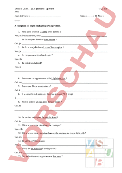 Arbeitsblatt: Envol 8, Unité 11 Les pronoms