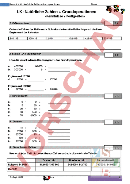 MathLK 5. Kl.: Natürliche Zahlen Grundoperationen Name: LK: Natürliche Zahlen Grundoperationen (Kenntnisse Fertigkeiten) 1. Zahlen ordnen 3 P. Ordne die Zahlen der Reihe nach. Schreibe die korrekte Reihenfolge auf die Linie. Beginne mit der kleinsten. 240146 420416 24641 402416 42641 204146 2. Stellen und Stufenzahlen 4 P. Löse die verschiedenen Rechnungen zu den Grundoperationen. a. b. 400‘000 300‘000 80‘000 8 Ergänze auf 10‘000 d. 6‘600 10‘000 Ergänze auf 100‘000 f. 32‘000 100‘000 3. Multiplikation a. b. c. d. e. 6 9 20 40 70 5 P. 9 80 60 500 8‘000 4. Division a. b. c. d. e. 18 1‘800 180‘000 180 18‘000 5 P. : : 3 300 30 3 300 5. Benachbarte Zahlen 6 P. Nenne zu jeder Zahl die benachbarten Zahlen und schreibe sie in die Tabelle. Beispiel: 342651 Zehnerzahl: Hunderterzahl: Tausenderzahl: 342‘650 342‘660 342‘600 342‘700 342 00 343‘000 256389 6. Sept. 2012 Viel Glück! 1 MathLK 5. Kl.: Natürliche Zahlen Grundoperationen Name: 63858 6. Zahlenmauer 6 P. Rechne schriftlich auf Häuschenpapier. 7. Rechendreiecke 6 P. Rechne schriftlich auf Häuschenpapier. 8. Malkreuz 3 P. 600 90 7 50 180 Beurteilung: Max. Punktzahl: 38 Punkte Note: Erreichte Punkte: Genügende Note: 6. Sept. 2012 Punkte Unterschrift der Eltern: Viel Glück! 2