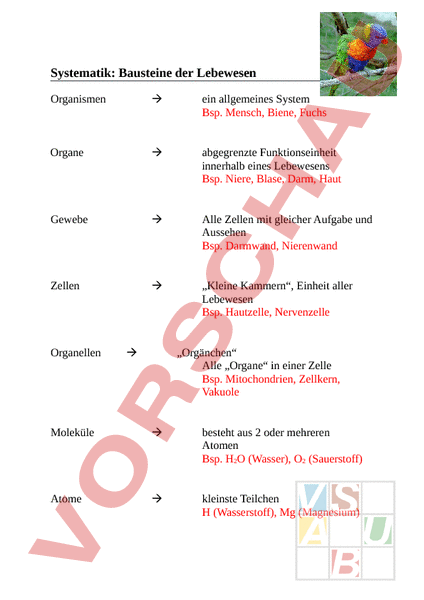 Systematik: Bausteine der Lebewesen Organismen ein allgemeines System Bsp. Mensch, Biene, Fuchs Organe abgegrenzte Funktionseinheit innerhalb eines Lebewesens Bsp. Niere, Blase, Darm, Haut Gewebe Alle Zellen mit gleicher Aufgabe und Aussehen Bsp. Darmwand, Nierenwand Zellen „Kleine Kammern, Einheit aller Lebewesen Bsp. Hautzelle, Nervenzelle Organellen „Orgänchen Alle „Organe in einer Zelle Bsp. Mitochondrien, Zellkern, Vakuole Moleküle besteht aus 2 oder mehreren Atomen Bsp. H2O (Wasser), O2 (Sauerstoff) Atome kleinste Teilchen (Wasserstoff), Mg (Magnesium)
