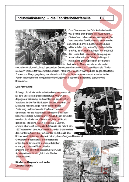 Industrialisierung die Fabrikarbeiterfamilie RZ Das Einkommen der Fabrikarbeiterfamilie war gering. Der grösste Teil wurde zum Einkauf von Lebensmitteln verwendet. Der Verdienst des Familienvaters reichte nicht aus, um die Familie durchzubringen. Die Mitarbeit der Frau war nötig. Früher hatte die Frau ihren Mann auf dem Hof oder bei der Heimarbeit unterstützt. Nun ging sie als Arbeiterin in die Fabrik und trug mit ihrem Lohn zum Überleben der Familie bei. Wie ihr Mann war sie an die meist vierzehnstündige Arbeitszeit gebunden. Daneben sollte sie noch mit dem Haushalt, für den sie kaum vorbereitet war, zurechtkommen. Kleinkinder wurden während des Tages oft älteren Frauen zur Pflege gegeben, manchmal auch älteren Geschwistern anvertraut oder in die Fabrik mitgenommen. Wegen der ungenügenden Pflege und Ernährung starben viele Kleinkinder. Das Fabrikkind Solange die Kinder nicht arbeiten konnten, waren sie für ihre Eltern eine grosse Belastung. Waren sie dagegen arbeitsfähig, so brachten sie zusätzlichen Verdienst in die Familienkasse. Zudem war man der Meinung, regelmässige Arbeit sei die beste Erziehung und hindere die Kinder an dummen Streichen. Für die Fabrikbesitzer waren die Kinder besonders billige Arbeitskräfte. Au all diesen Gründen wurden die Kinder so früh wie möglich zur Arbeit geschickt. Meistens traten sie mit ca. 8 Jahren, oftmals aber auch schon ab 4 Jahren in die Fabrik ein. 1827 waren von den Arbeitskräften in den Spinnereien des Kantons Zürich die Hälfte unter 16 Jahre alt. Die Kinder verrichteten vor allem Arbeiten, die auf engem Raum viel Gewandtheit benötigten. So mussten sie unter den Spinnmaschinen herumkriechen, um abgebrochene Fäden wieder anzuknüpfen oder Spulen aufzusetzen. Die Arbeitszeit war für sie gleich wie für die Erwachsenen. Kinder im Bergwerk und in der Landwirtschaft In Grossbritannien wurden die Kinder häufig für Bergwerksarbeiten verwendet. 1842 waren 41 Prozent der Bergwerksarbeiter minderjährig. Auch in der Heimarbeit und in der Landwirtschaft fand Kinderarbeit statt. Verdingkinder In ländlichen Gebieten „verdingten Eltern ihre Kinder, wenn sie nicht genügend für sie sorgen konnten. Das heisst, die Kinder wurden ähnlich wie auf einem Sklavenmarkt angepriesen. Bauern kamen und schauten sich wie am Markt die Kinder an, welche sie für etwas Geld bei ihnen in den Dienst nehmen wollten. Die leiblichen Eltern erhielten ein Entgelt für ihr Kind und das Kind musste sich fortan bei den Bauern verdingen. Das heisst, sie mussten im neuen Bauernbetrieb arbeiten und bekamen dafür Kost und Logie. Allerdings wurden die Kinder oftmals zu schrecklichen Bedingungen „gehalten. Viele mussten hungern und mussten auf dem Boden oder im Stall schlafen.